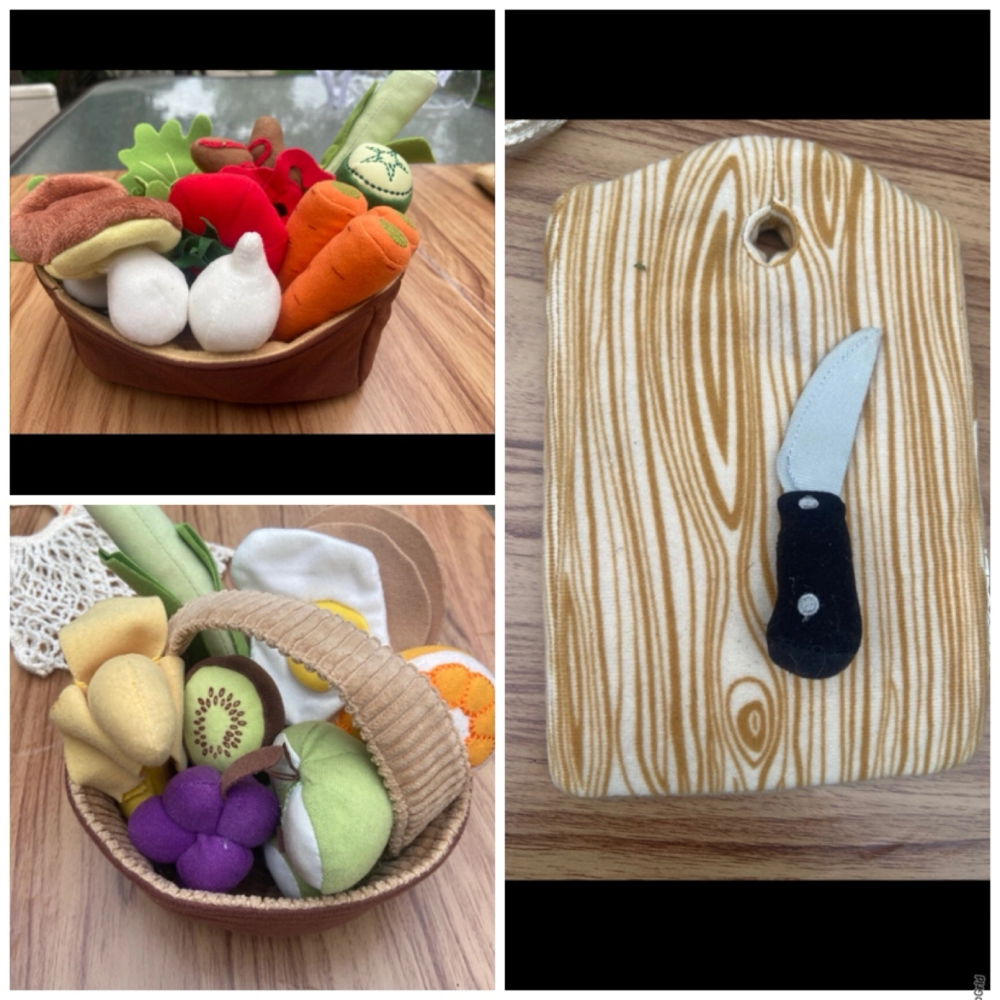 A. Encourage imaginative play with this adorable set of handcrafted felt food items. This charming collection includes a variety of felt fruits, vegetables, and other food items, perfect for little ones to create their own pretend meals. The set comes with a cute basket and a mesh bag for easy storage and transportation. This used item is in good condition.