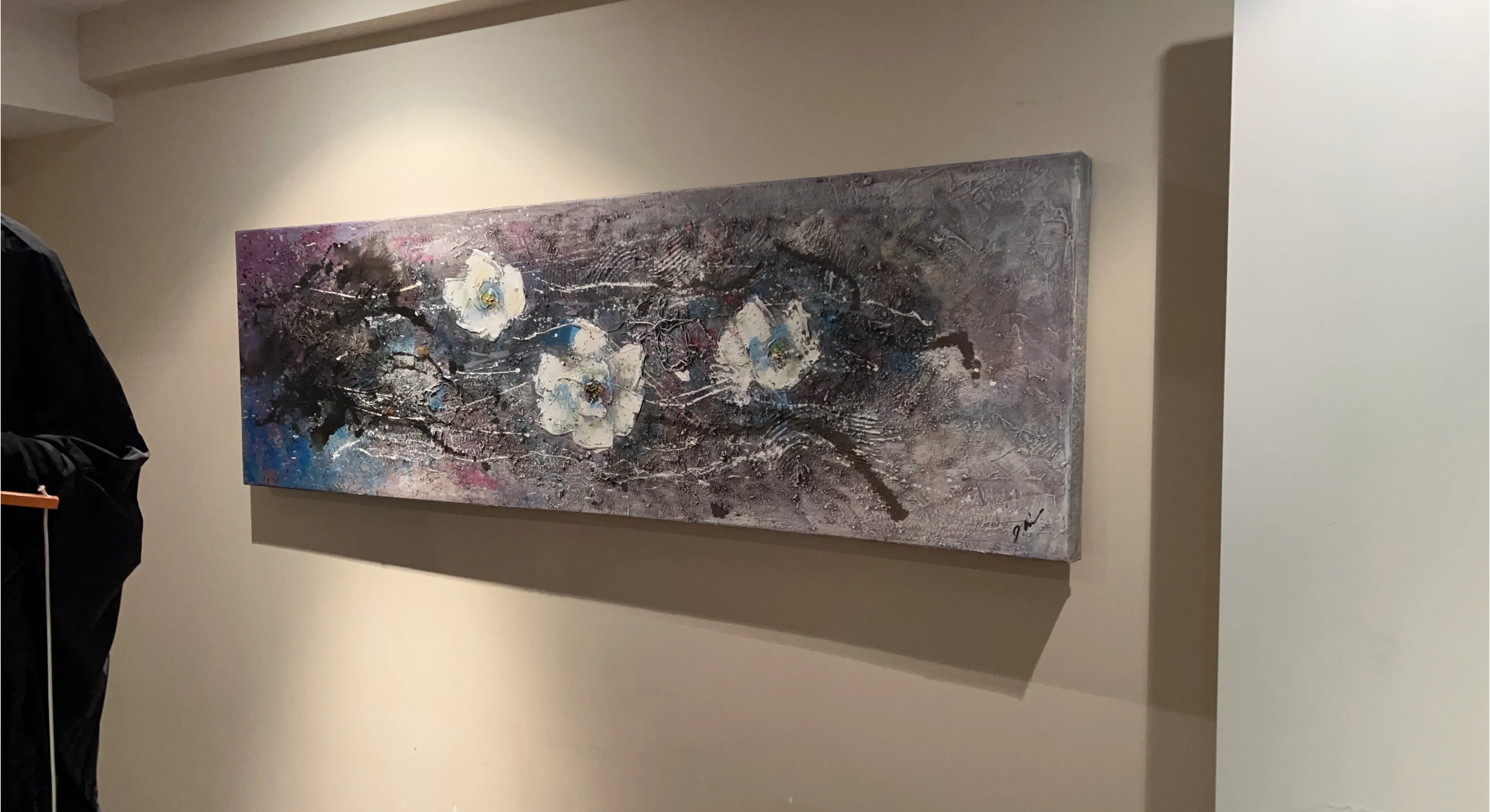 Here is an abstract painting with floral elements. The canvas features a textured surface with a mix of grey, white, blue, and black hues. It would be a great addition to any home!