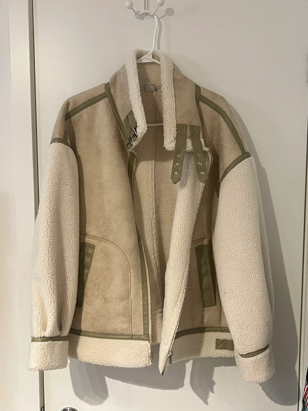 Cozy up in this aviator jacket! It features a soft, faux shearling lining and stylish beige exterior. Perfect for adding a touch of warmth and style to your wardrobe