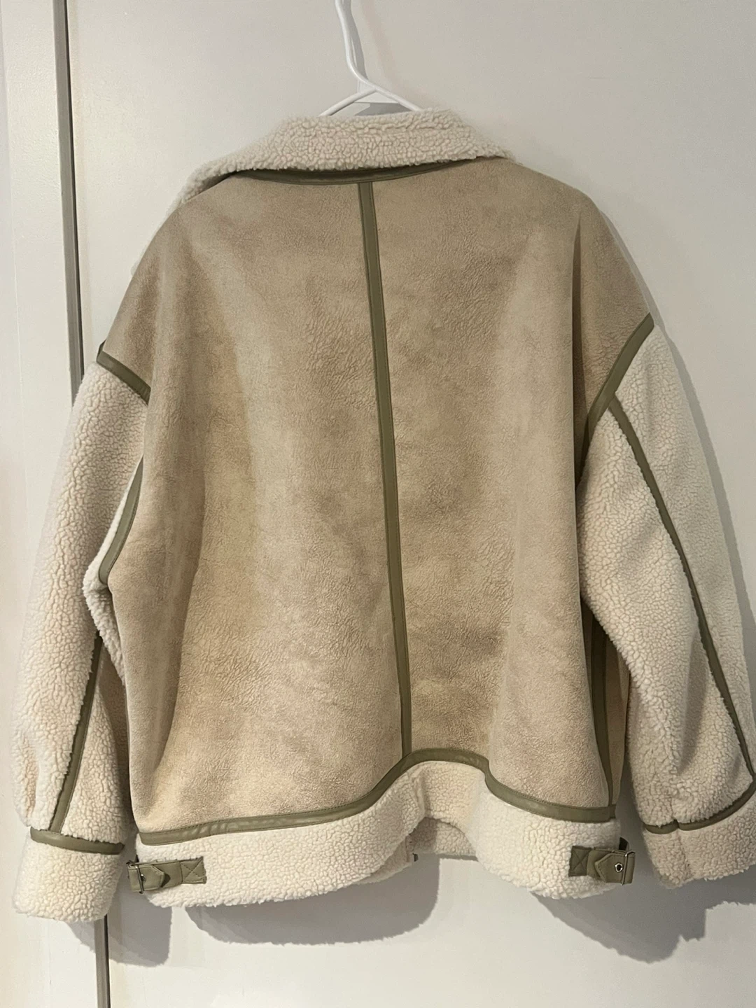Cozy up in this aviator jacket! It features a soft, faux shearling lining and stylish beige exterior. Perfect for adding a touch of warmth and style to your wardrobe