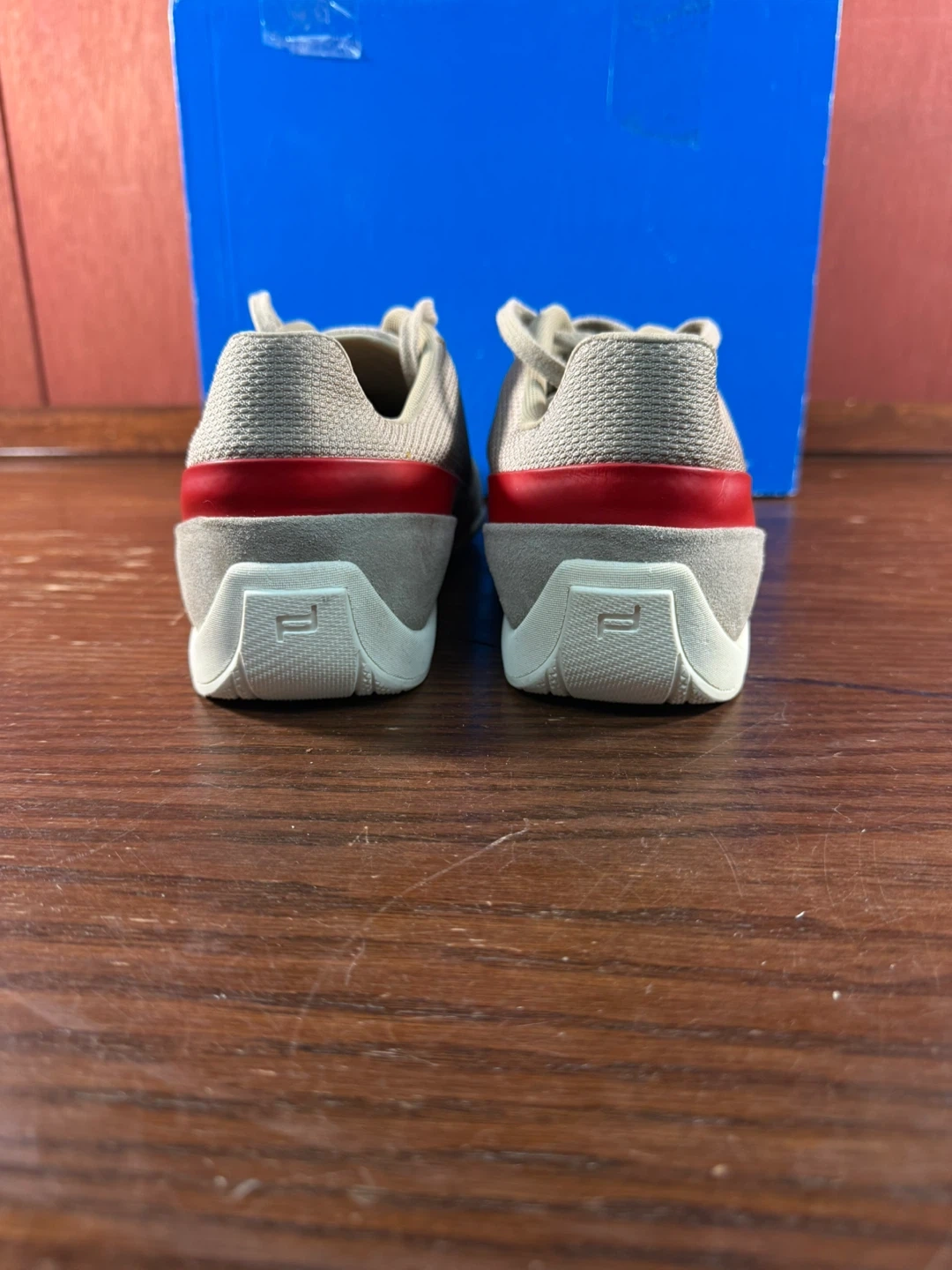 Sleek Porsche Design sneakers in gray with striking red accents. Ideal for a modern, casual look.