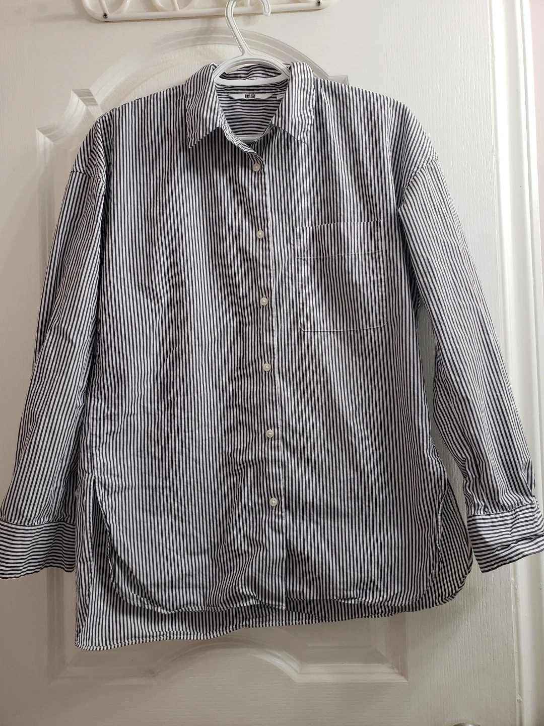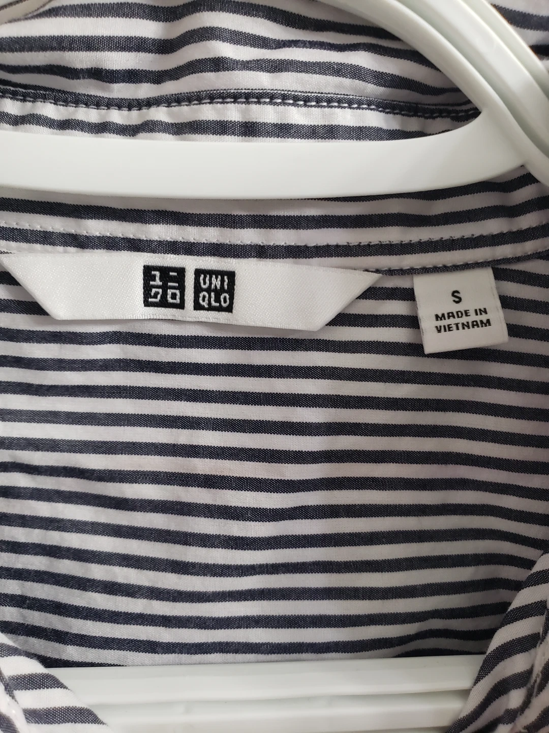 This is a Uniqlo long-sleeved button-up shirt. It's a size small with a classic striped pattern. Made in Vietnam.