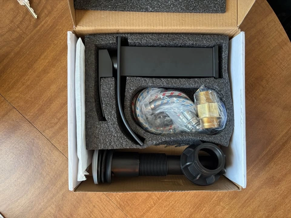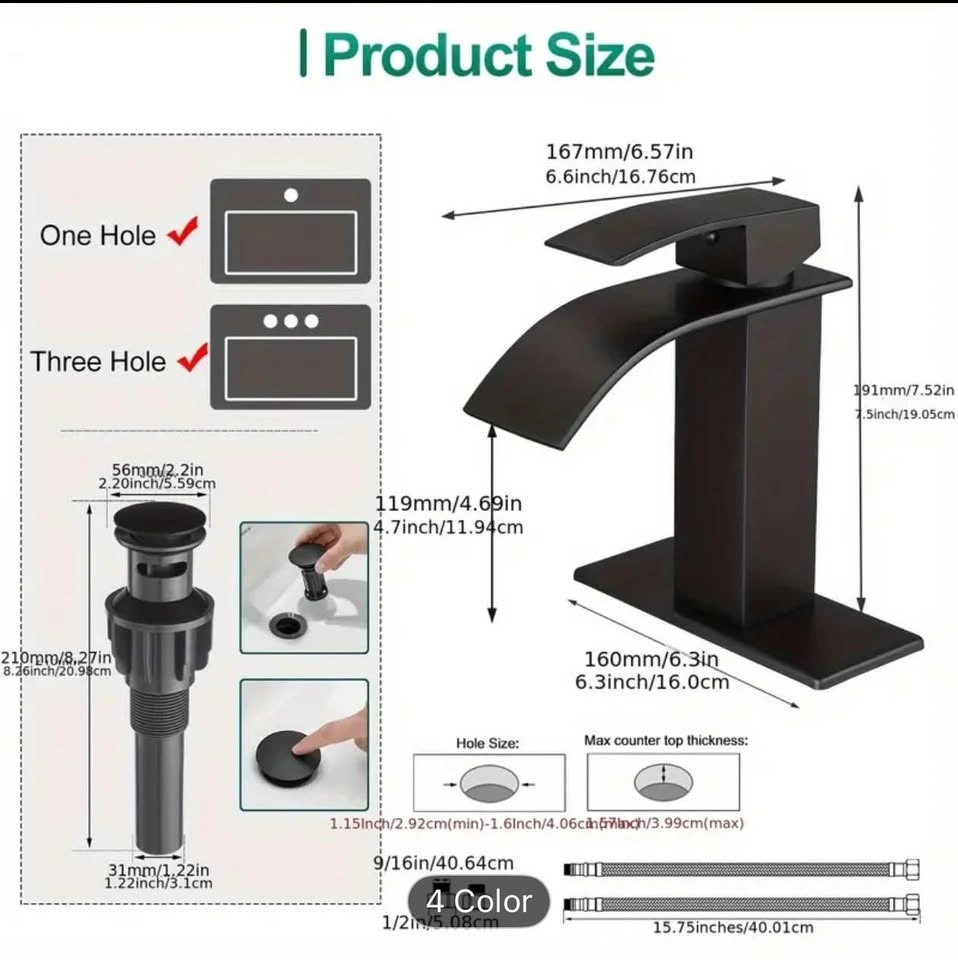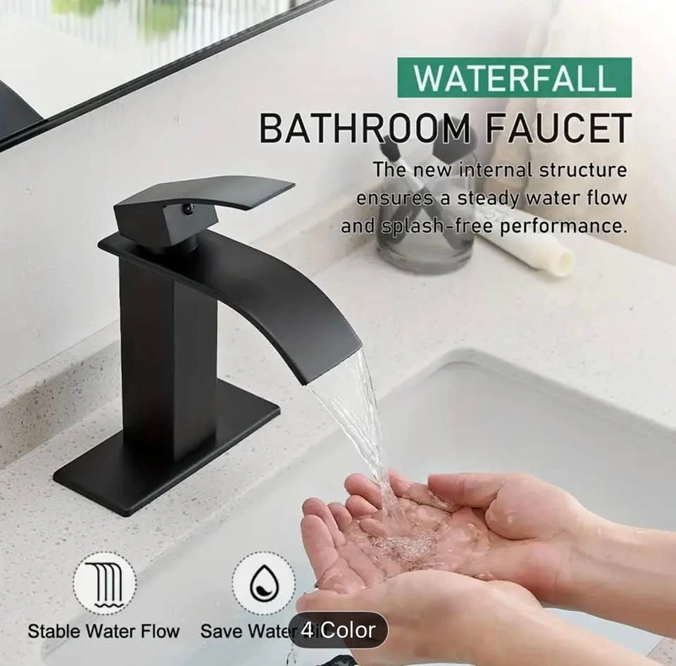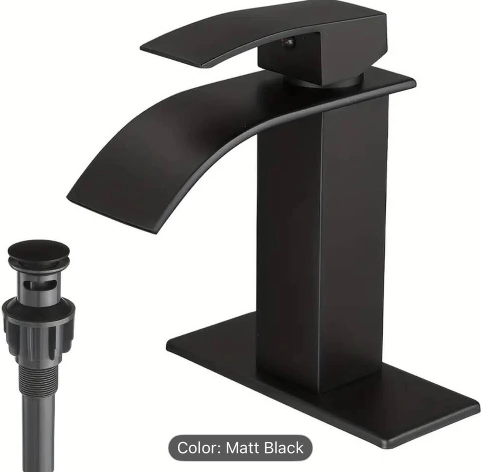Single handle bathroom sink faucet with a waterfall spout. Suitable for RV lavatories and vanities. Can be installed on sinks with one or three holes and comes with water supply lines. Finished in matte black.