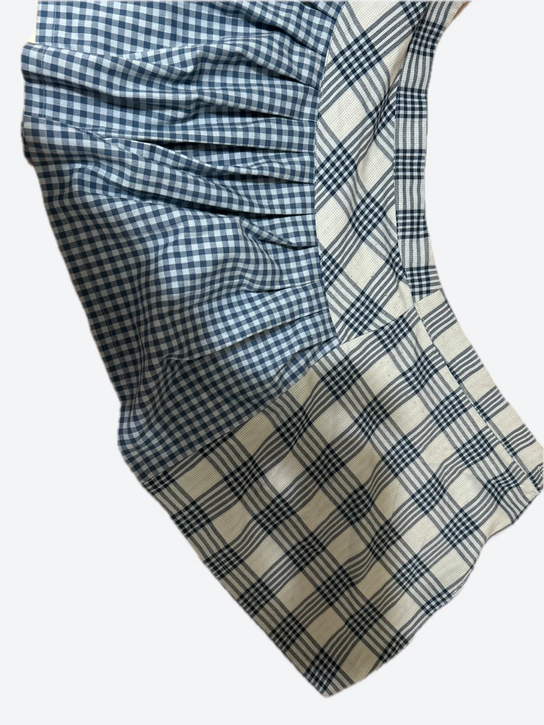The skirt features a unique combination of two different plaid patterns and pleated detailing.