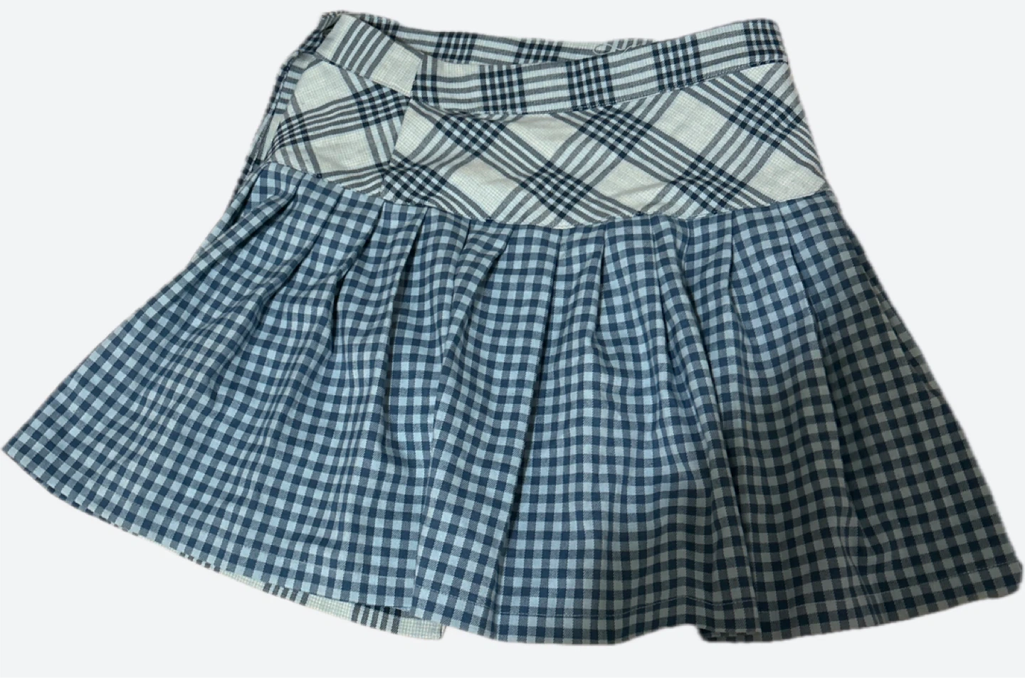 The skirt features a unique combination of two different plaid patterns and pleated detailing.