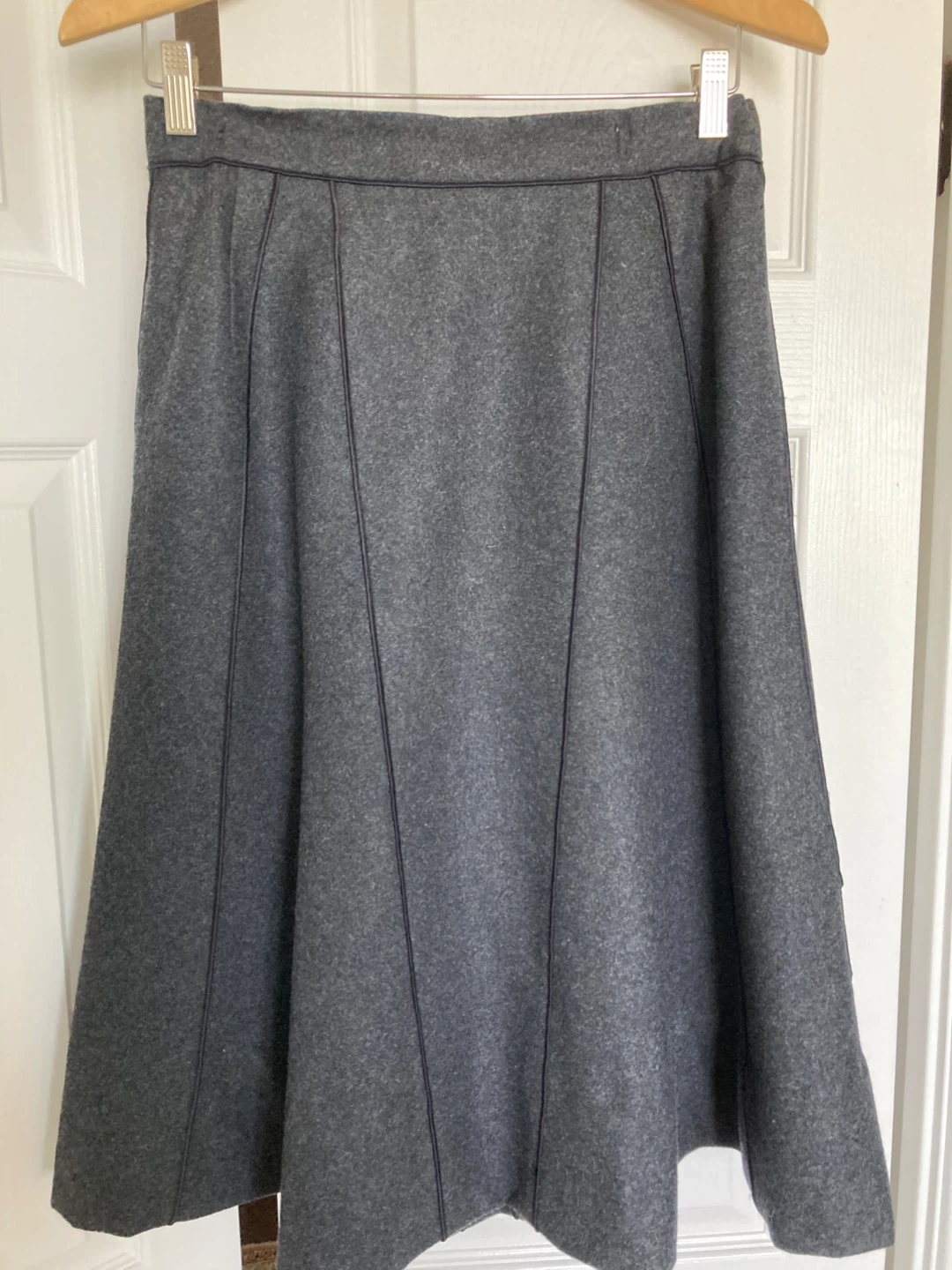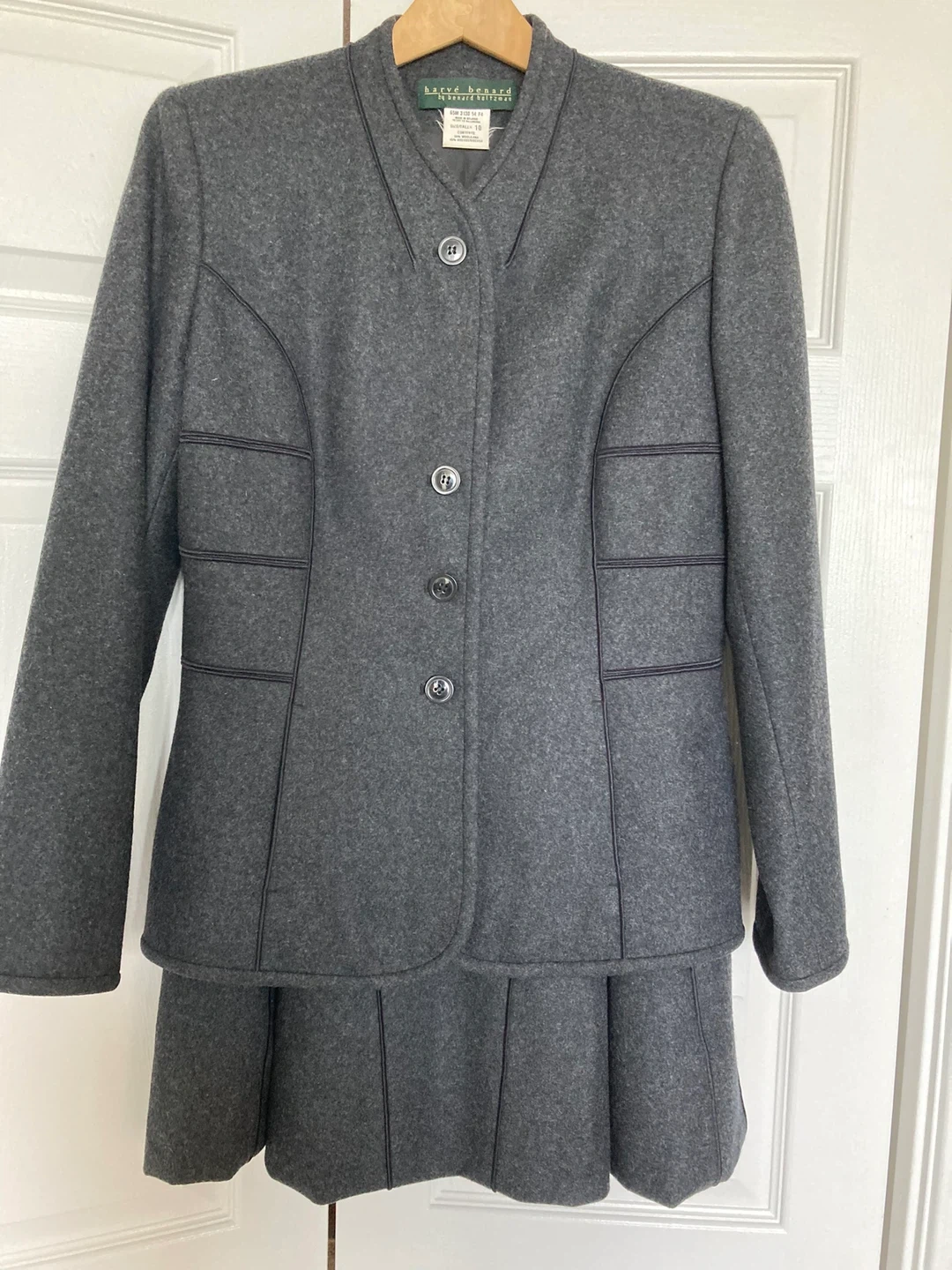 This is an elegant classy skirt suit in a grey colour. The suit features a tailored jacket and a pleated skirt. Very flattering style. It's made from a textured wool blend material. Perfect for professional or formal occasions! Fantastic craftsmanship. Excellent condition.