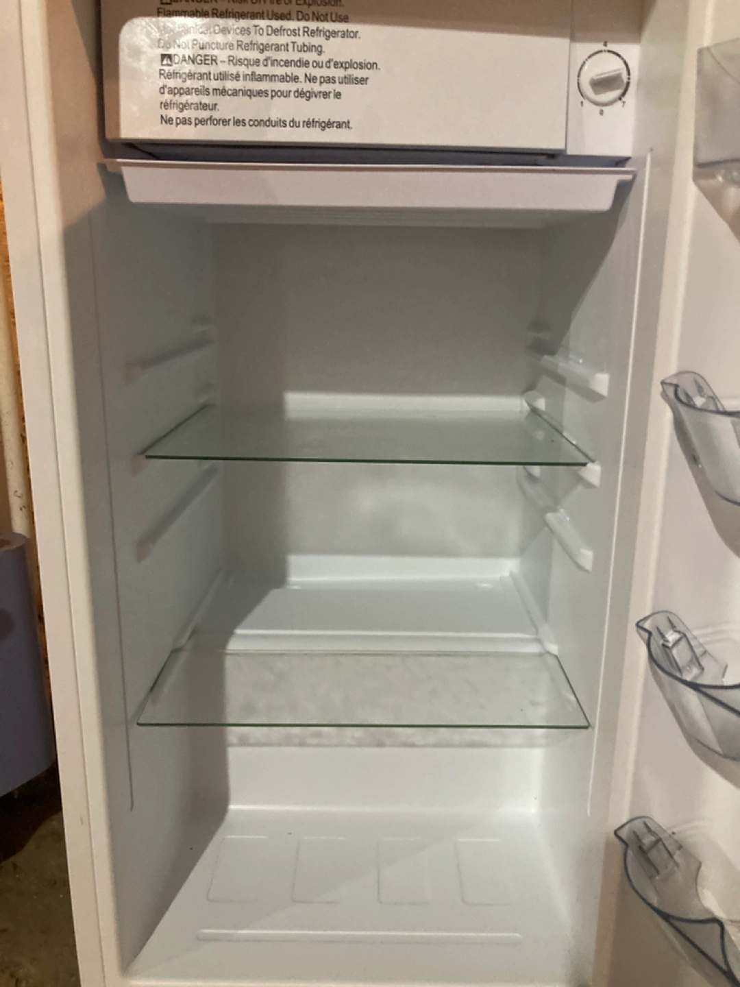 Impeccably clean mini fridge in very good working condition. One of the shelves has a crack in it (see third photo).