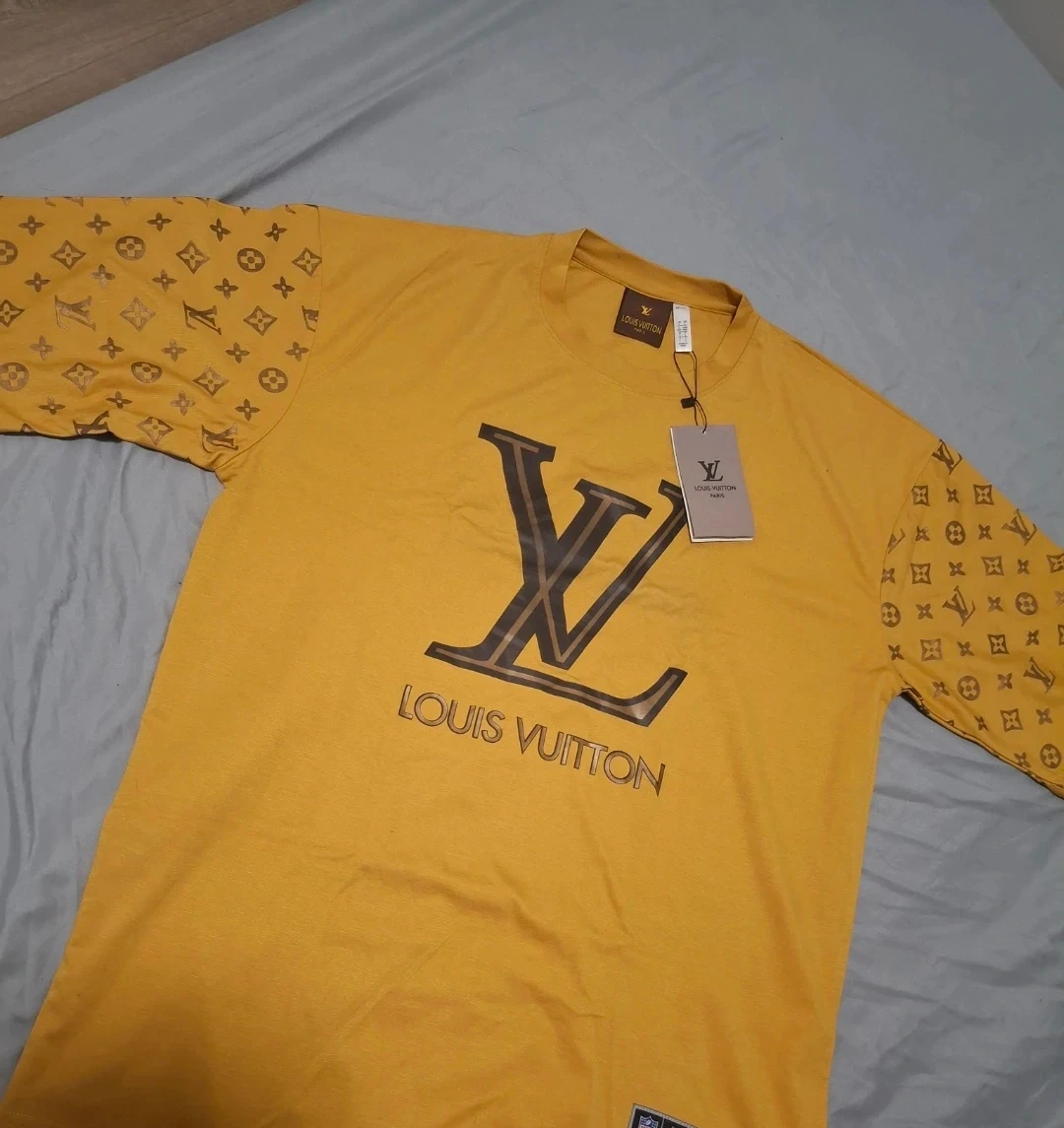 This is a Louis Vuitton Paris t-shirt in yellow. It features the iconic LV monogram pattern on the sleeves and a large LV logo on the front. Cotton material. Its brand new, never wear it