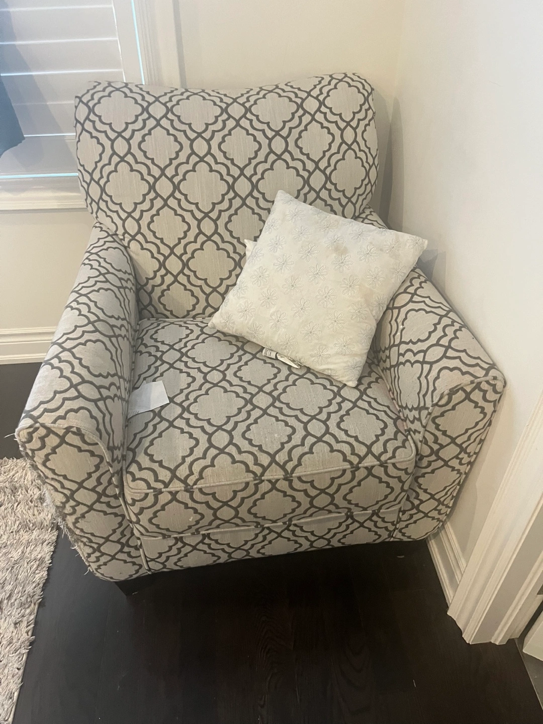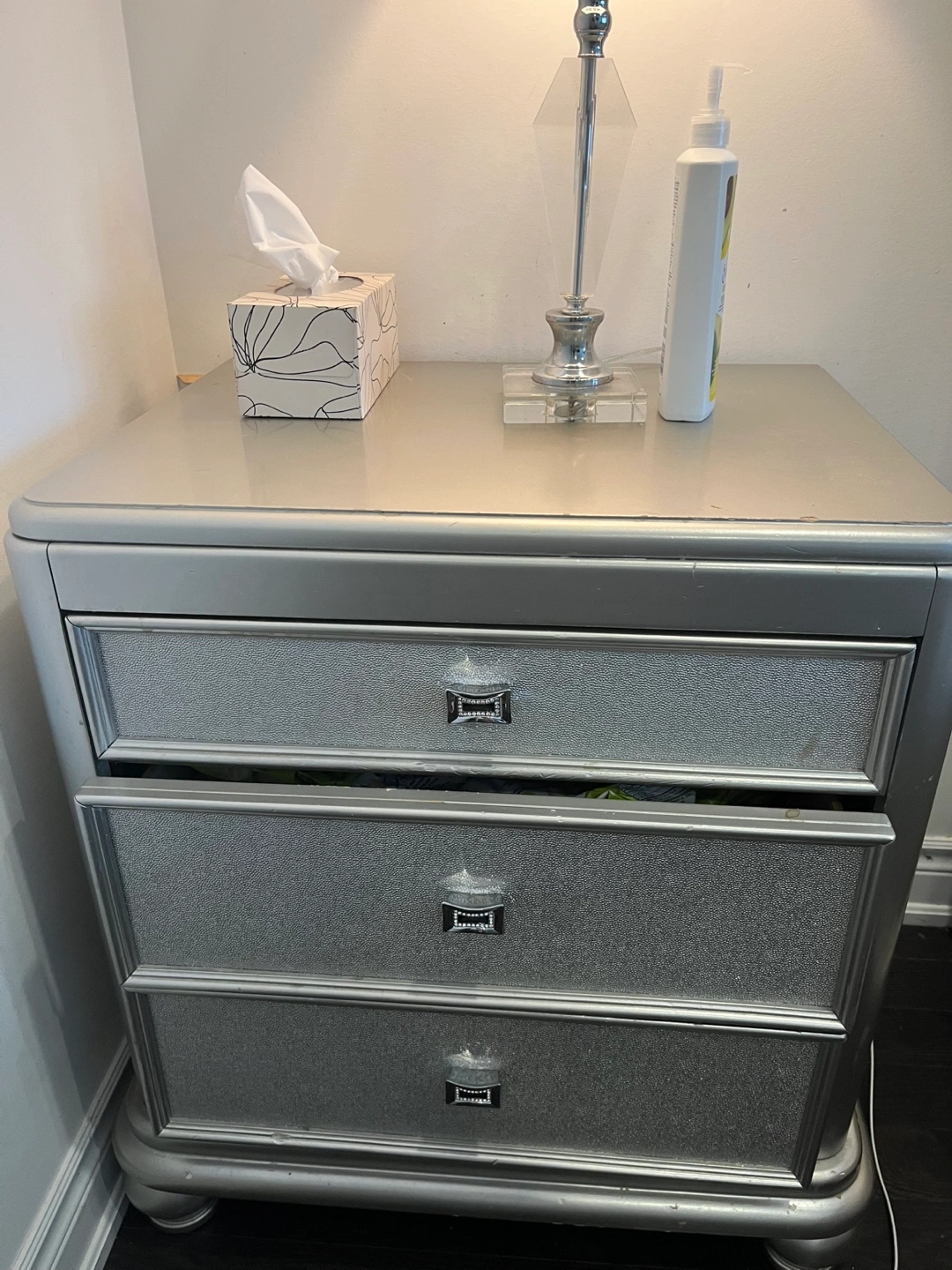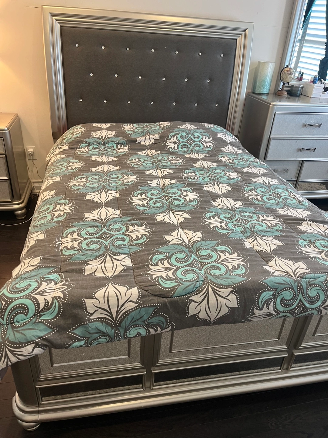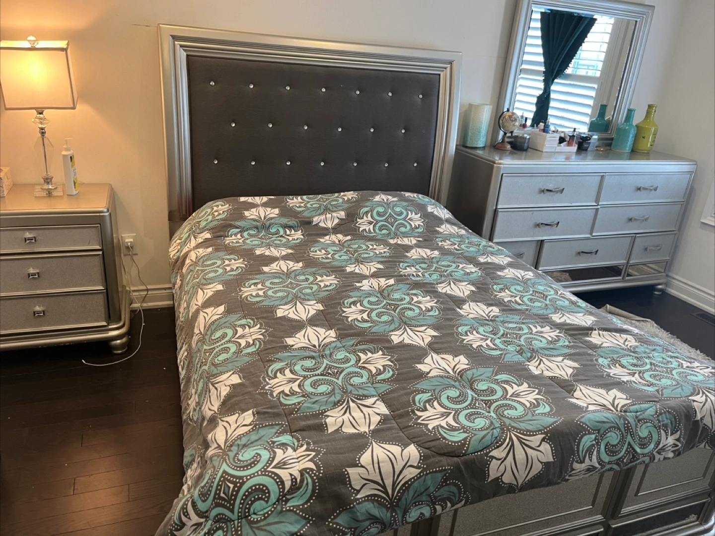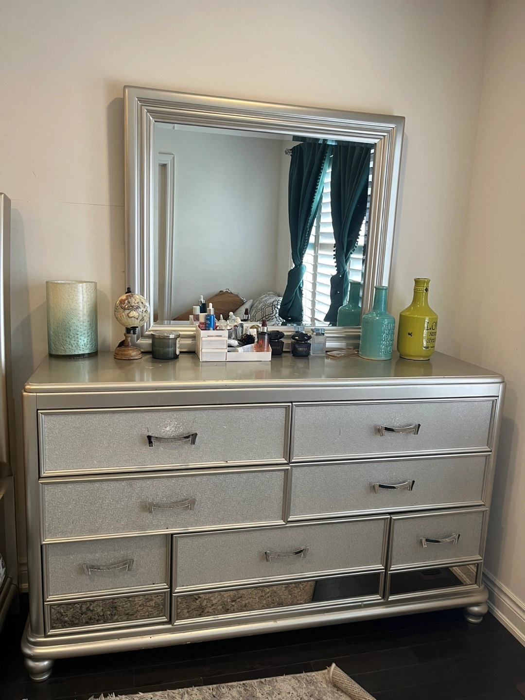 Selling a bedroom set that includes a dresser with a mirror, a nightstand, a bed frame, and a patterned chair. All items are in good condition and have a silver finish.