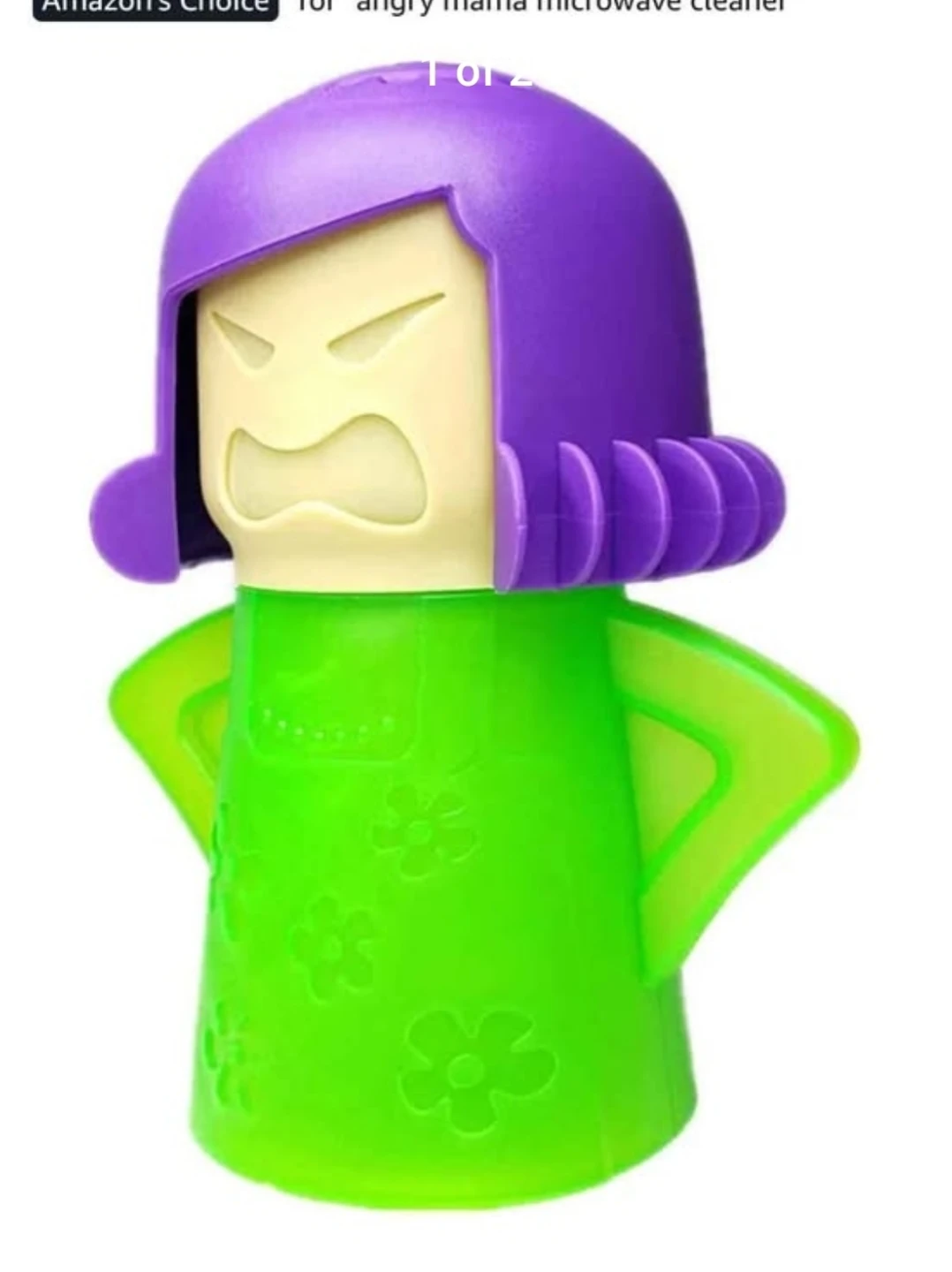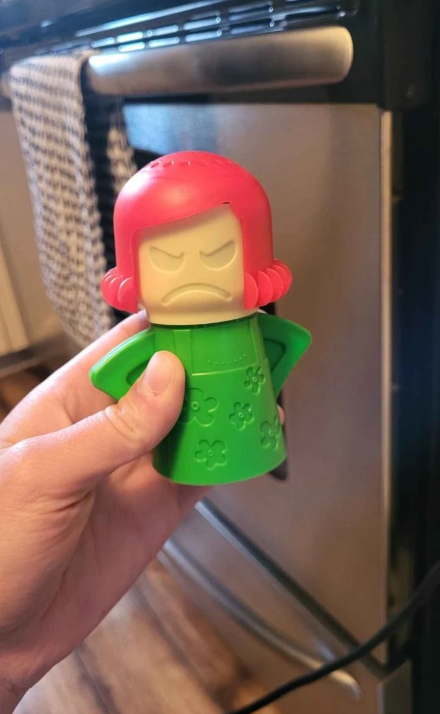 This is the Angry Mama microwave cleaner. It uses steam to help clean your microwave. Just add vinegar and water, then microwave for 5 minutes. It's a fun way to tackle microwave messes!
