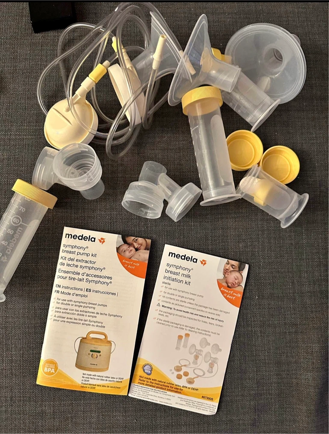 This is a Medela Symphony breast pump kit. It includes various accessories for double or single pumping. The kit is made without natural rubber latex, BPA, or DEHP.