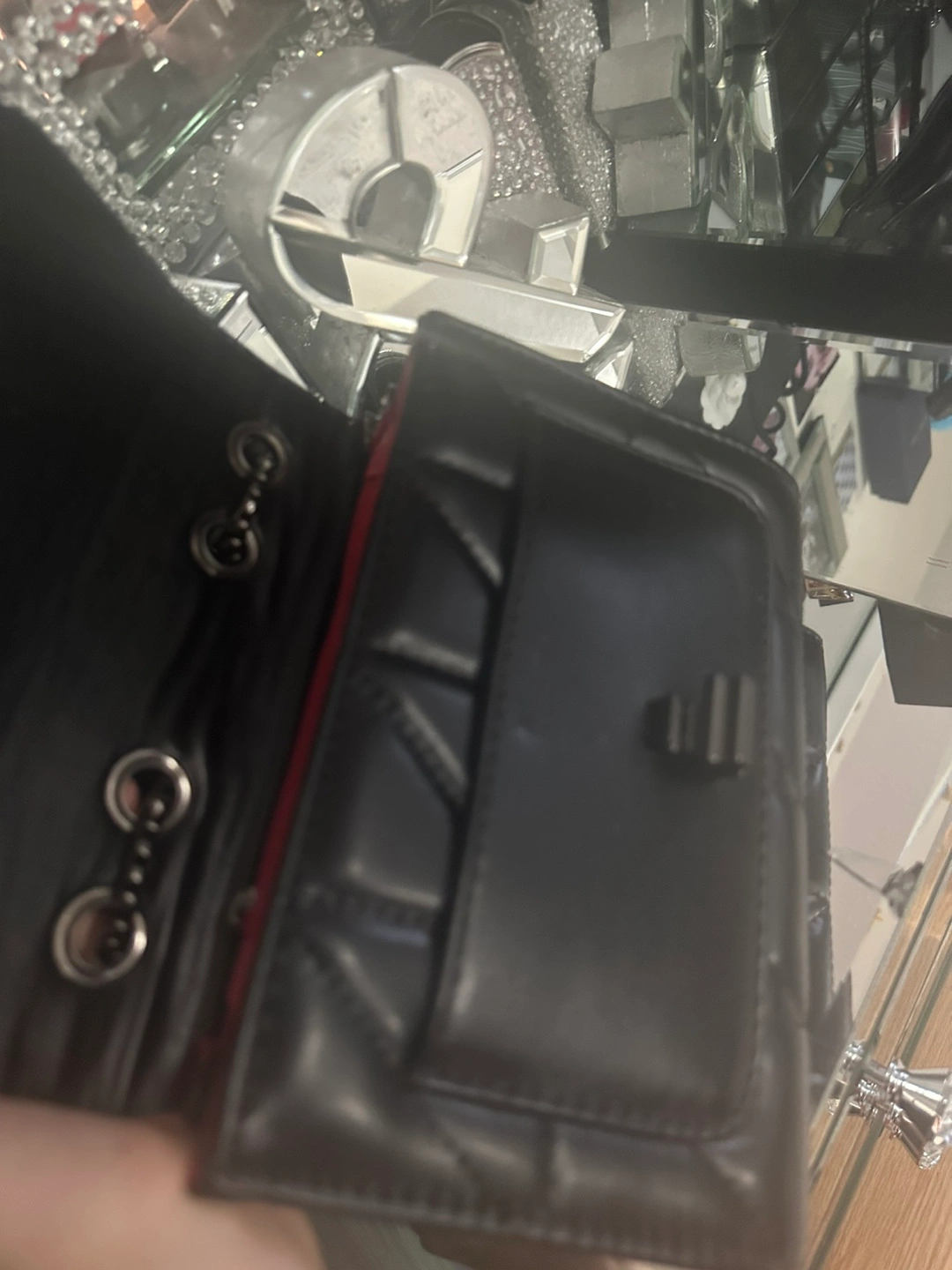 It's in great condition and the interior is lined with a vibrant red fabric and includes a zippered pocket.