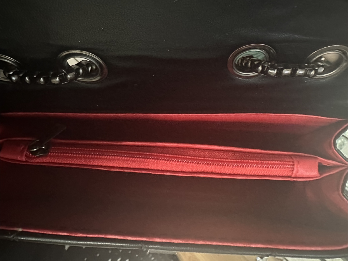 It's in great condition and the interior is lined with a vibrant red fabric and includes a zippered pocket.