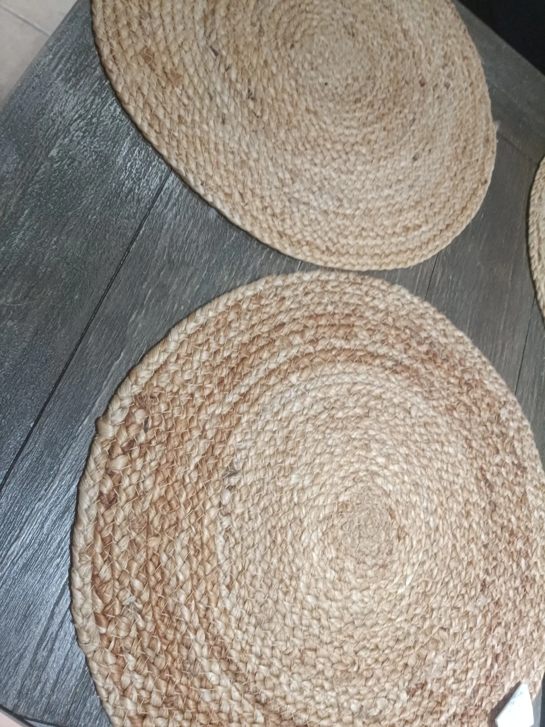 Beautiful Set of four round placemats made from natural jute. They're handmade and perfect for adding a rustic touch to your dining table. Each placemat has a woven texture.