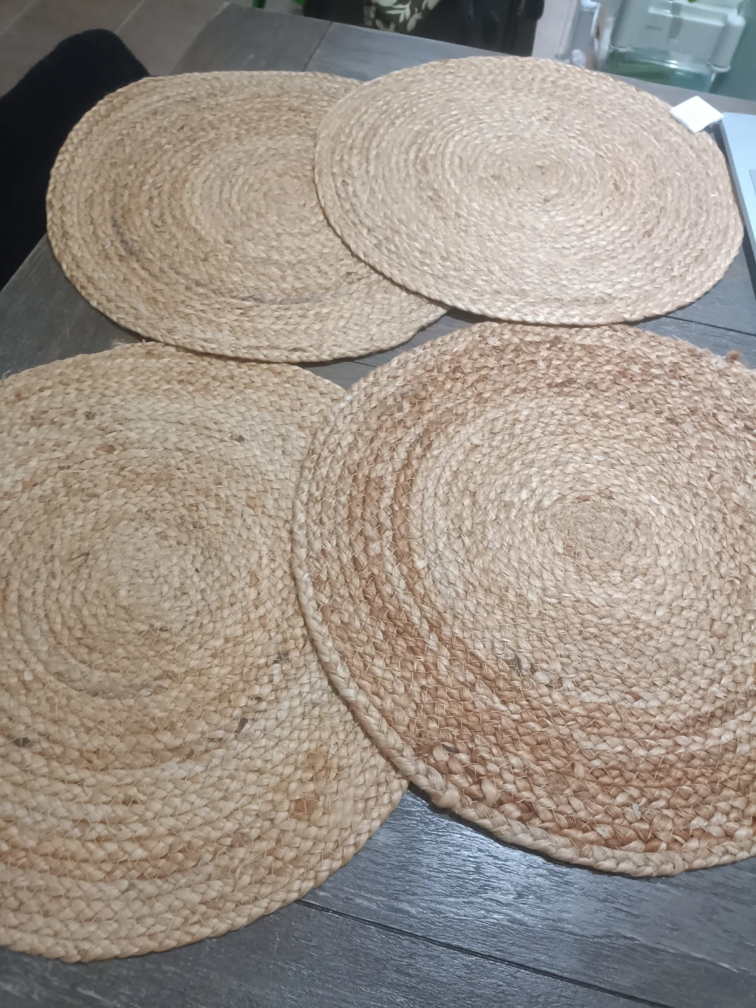 Beautiful Set of four round placemats made from natural jute. They're handmade and perfect for adding a rustic touch to your dining table. Each placemat has a woven texture.