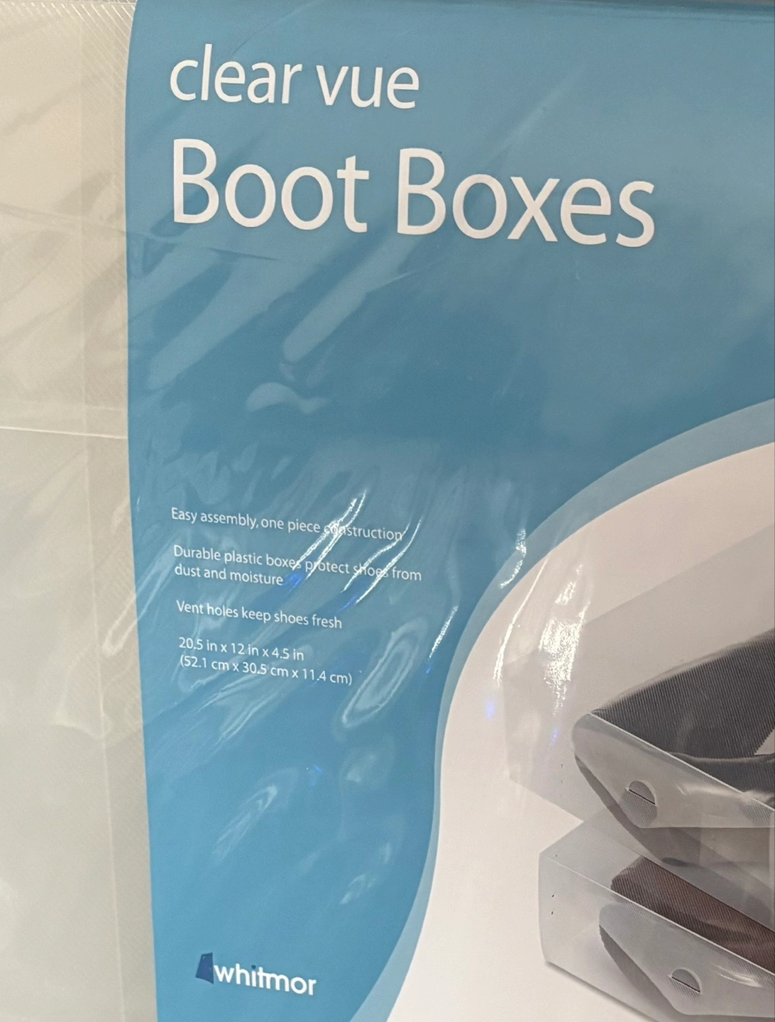 Set of two clear plastic boot boxes. Durable, easy assembly. Protects shoes from dust and moisture. Keeps shoes fresh.