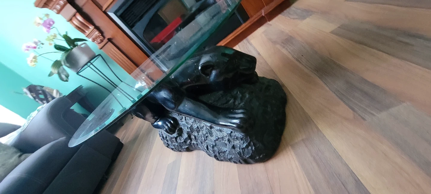 Unique coffee table featuring a glass top supported by a detailed black panther sculpture base. It's made of resin and glass. This piece adds a bold statement to any living space! Obo