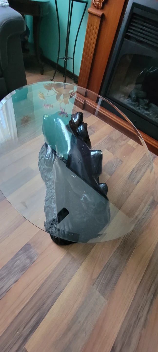 Unique coffee table featuring a glass top supported by a detailed black panther sculpture base. It's made of resin and glass. This piece adds a bold statement to any living space! Obo