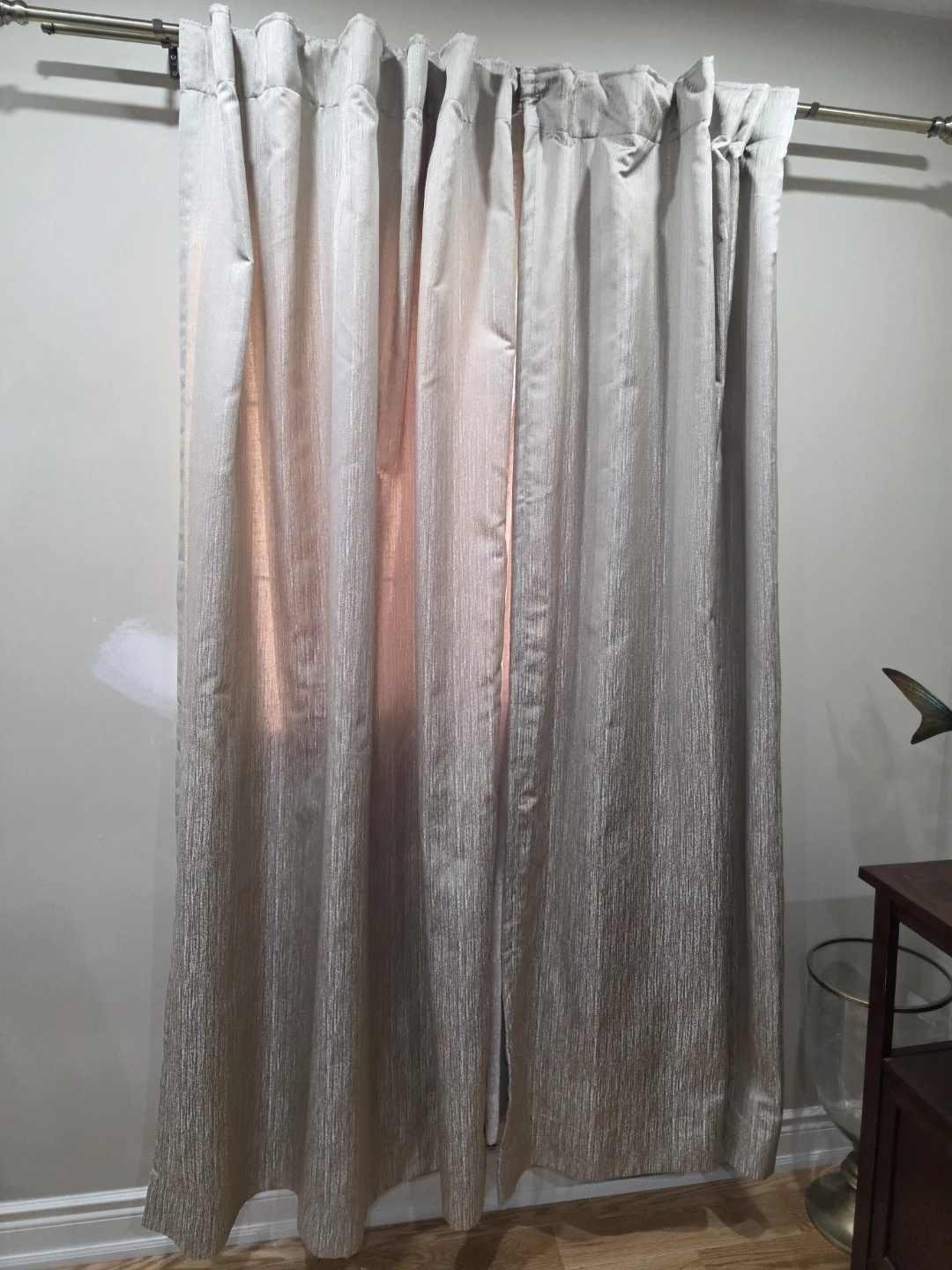 These are beige color curtains. We have a few available in 2 different sizes. Bigger curtains is of 50$ each and are 73×85 and smaller ones are 30 $ each and 49×84.They can be used in bedroom or living room.