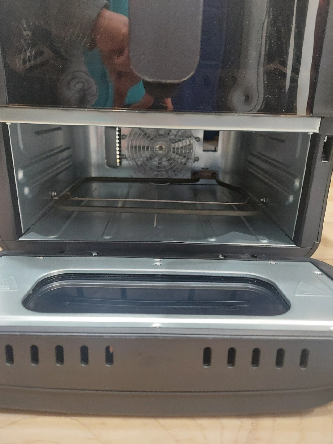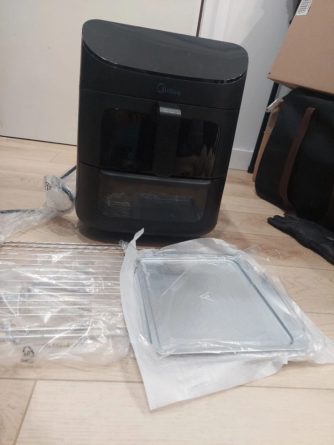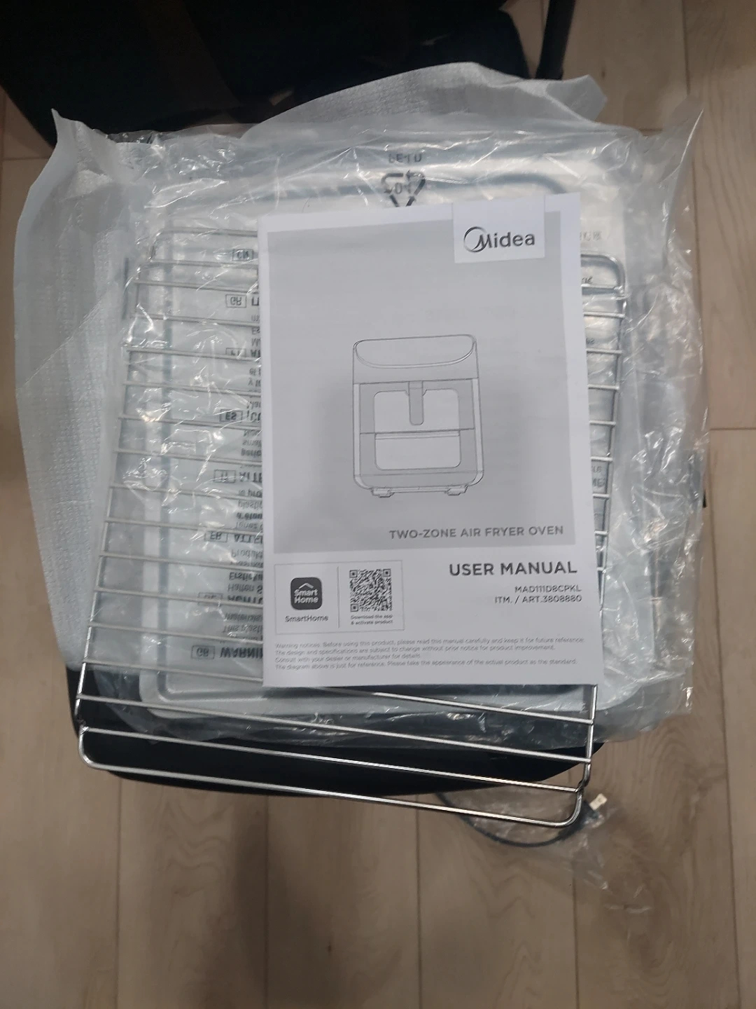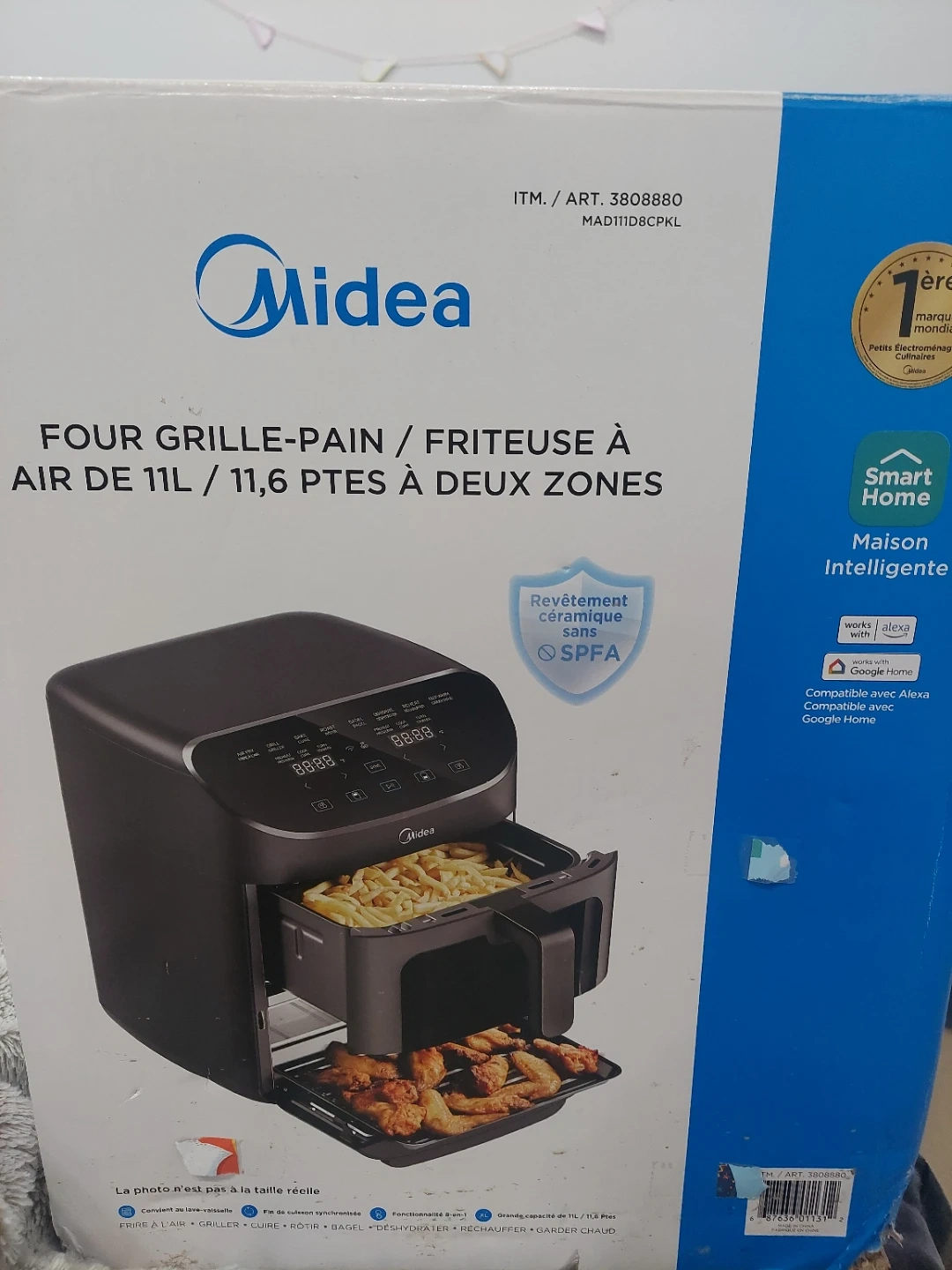 New Midea two-zone air fryer oven with an 11L capacity. It includes racks and a tray. It's designed for versatile cooking.