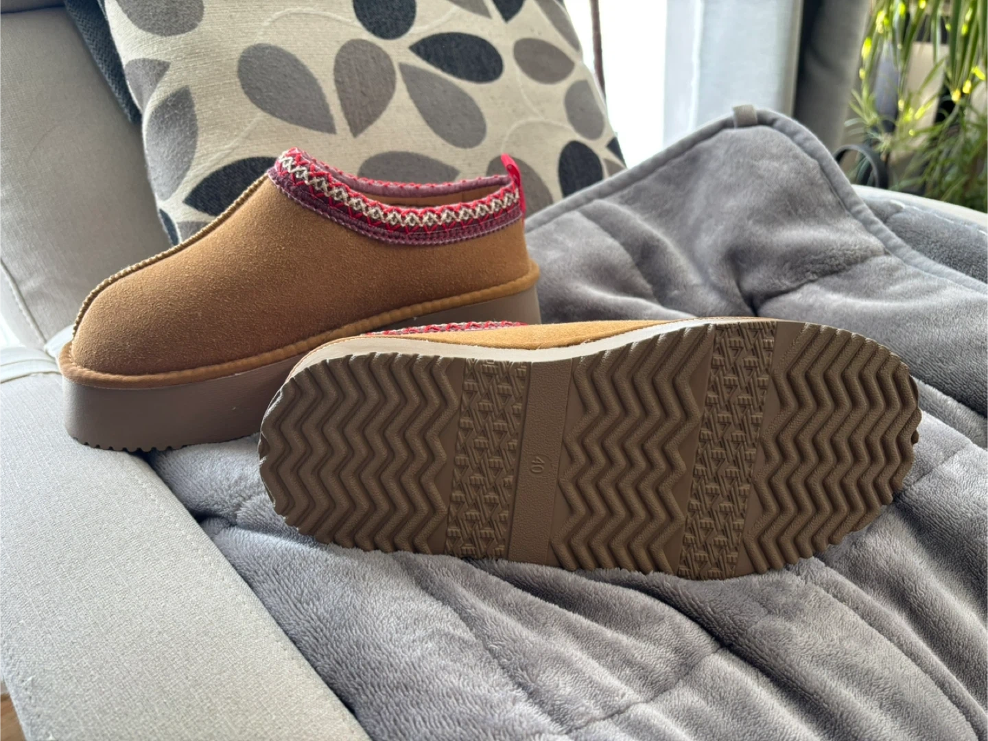 Cozy brown suede slipper mules with a faux shearling lining. These slip-on shoes feature a decorative knit trim and a durable rubber sole. Size 40.
