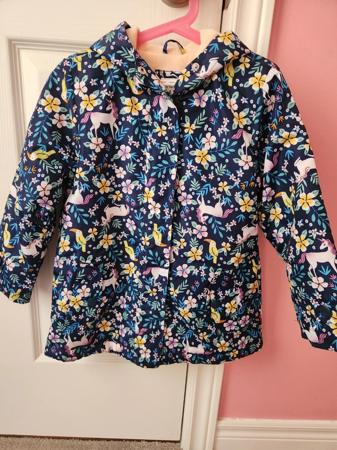 This cute Carter's jacket with hoodie features a navy background with a fun unicorn and floral print. It's lined with a soft, cozy fleece material. Perfect for keeping your little one warm on cooler days!