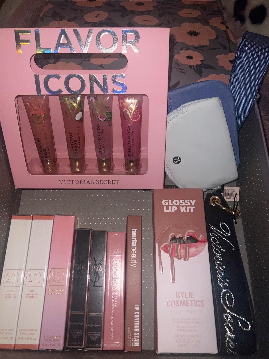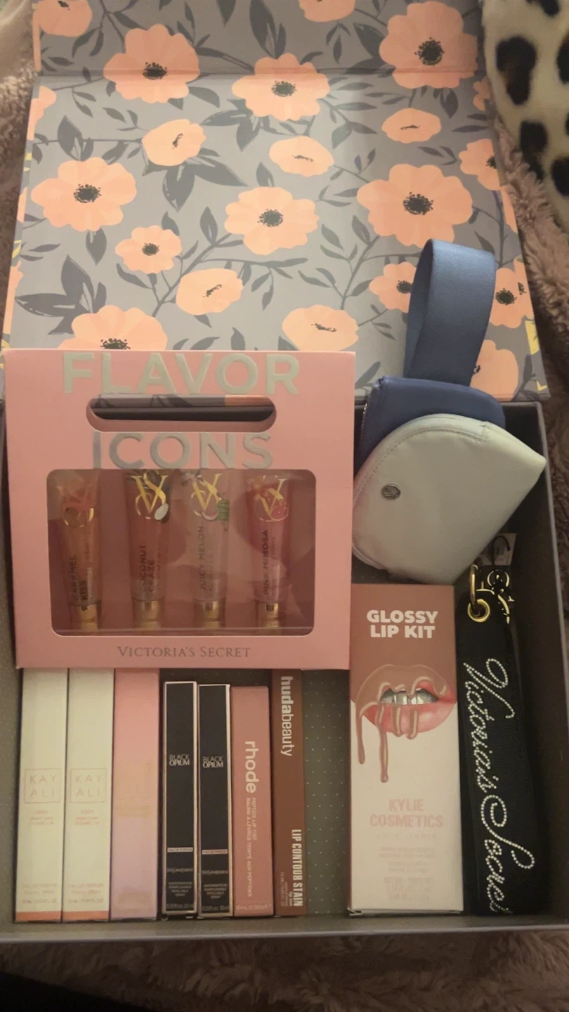 This bundle includes a Victoria's Secret Flavor Icons lip gloss set, a Kylie Cosmetics Glossy Lip Kit, and several other lip products from brands like Huda Beauty, Kayali, and Yves Saint Laurent. Perfect for makeup enthusiasts or those looking to try various lip products.