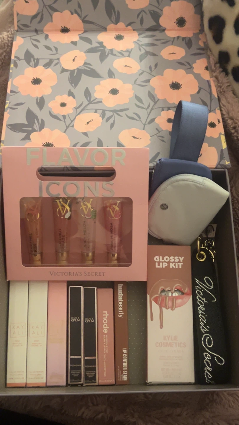 This bundle includes a Victoria's Secret Flavor Icons lip gloss set, a Kylie Cosmetics Glossy Lip Kit, and several other lip products from brands like Huda Beauty, Kayali, and Yves Saint Laurent. Perfect for makeup enthusiasts or those looking to try various lip products.