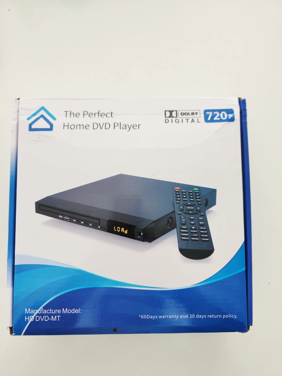 This is The Perfect Home DVD Player, model HD DVD-MT. It supports CD, DVD, DVD-R/+R, DVD-R/+RW, VCD, and SVCD discs. It also plays MP3, JPG, and AVI files via USB. It comes with a remote control, RCA cable, and power plug.