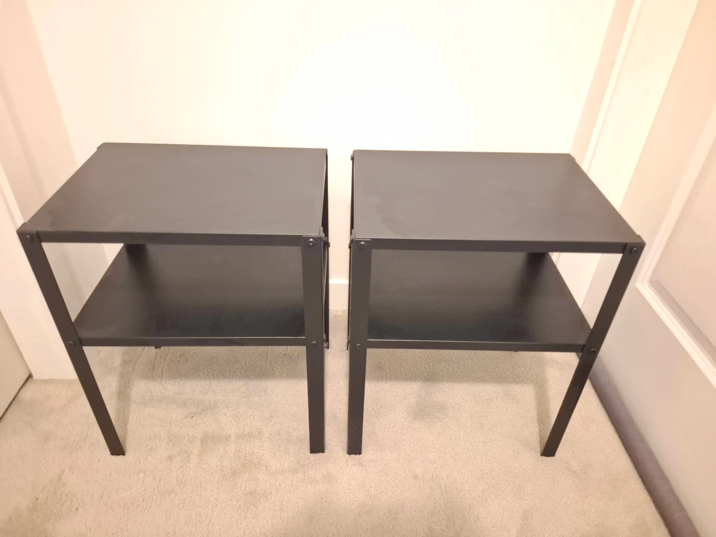 Selling a pair of black metal side tables. Each table has two tiers, offering storage and surface space. Made of metal, these are sturdy and versatile.