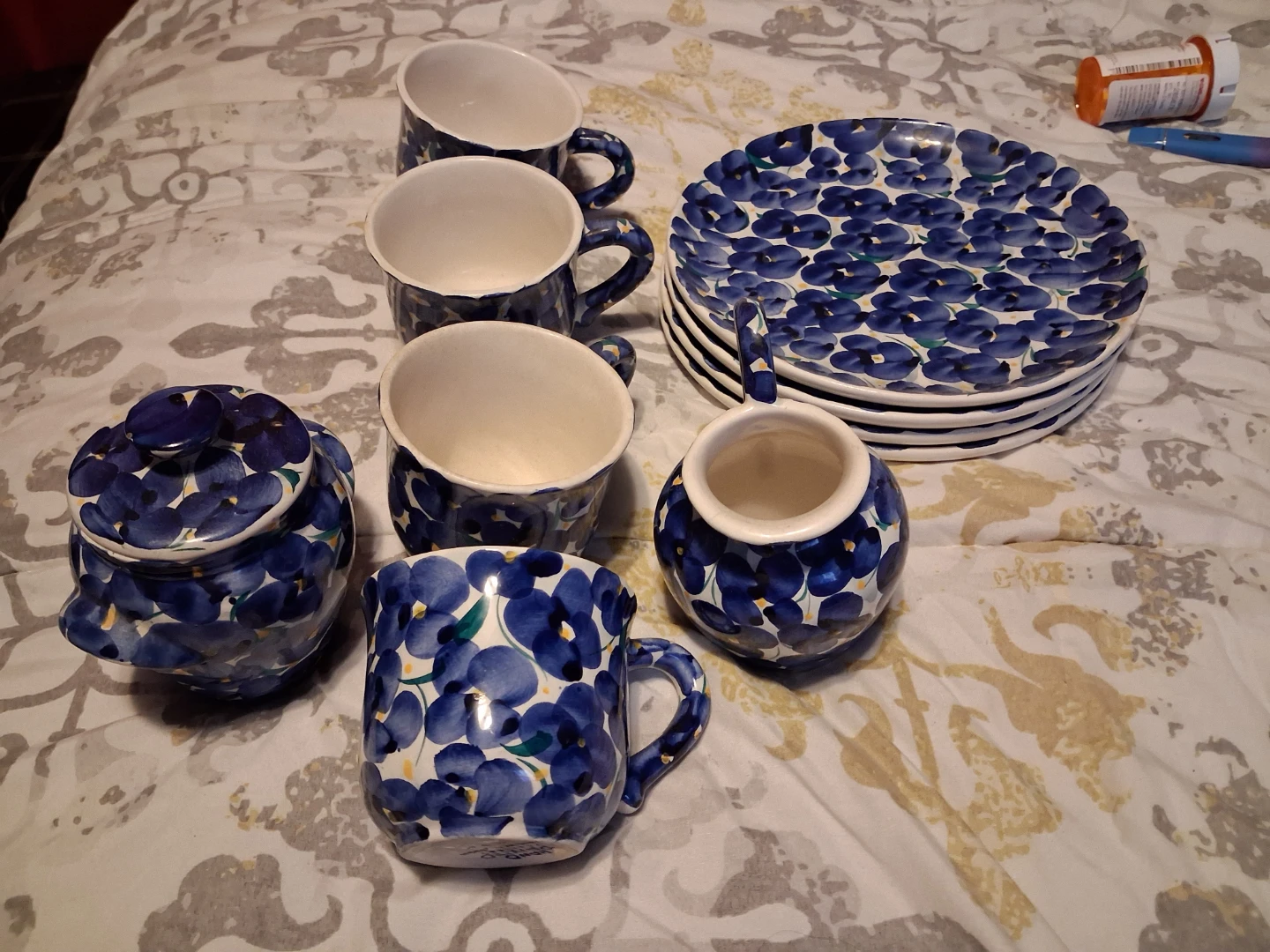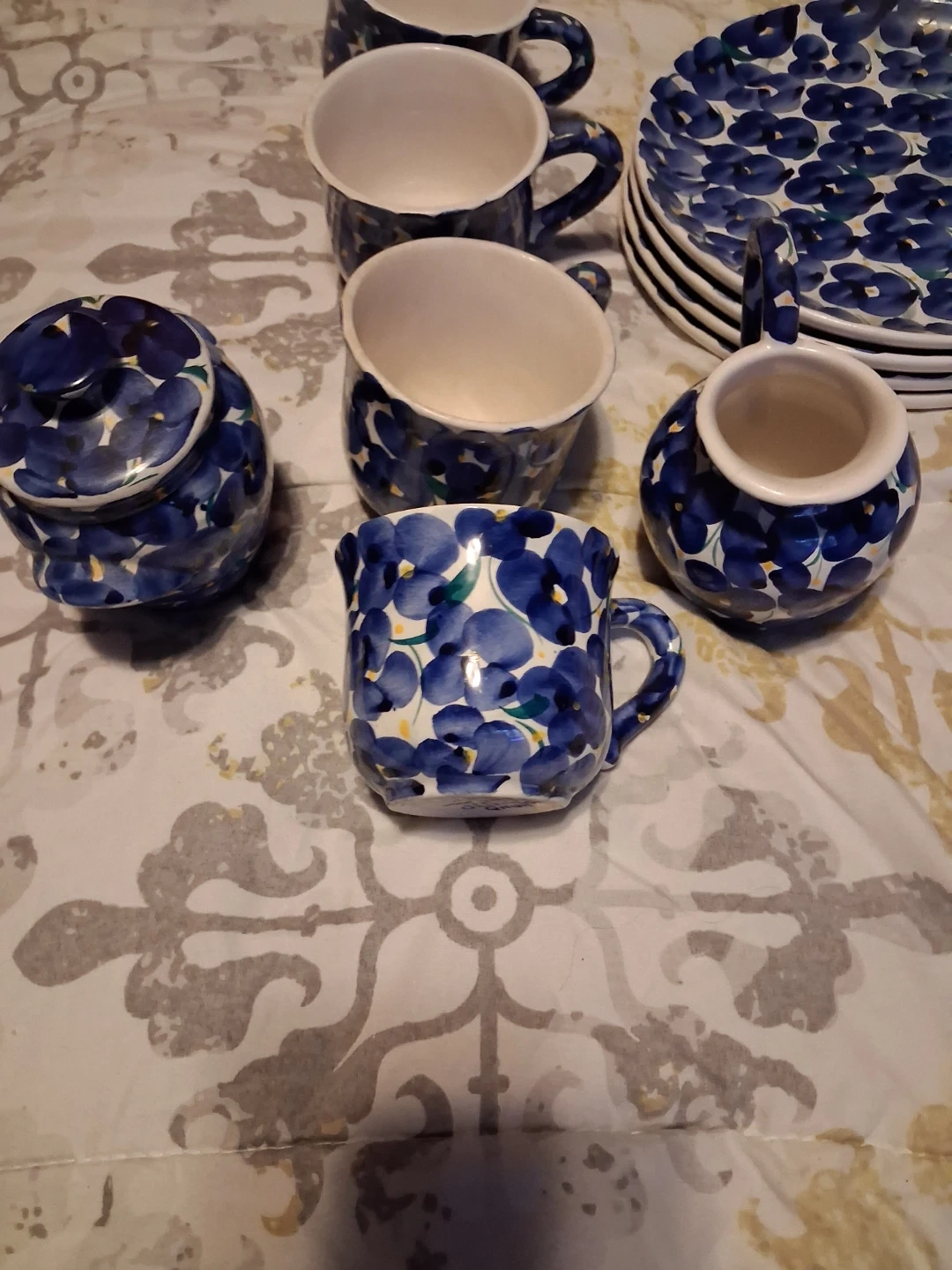 This charming ceramic tea set features a hand-painted blue floral design. Includes four cups, a sugar bowl with lid, a creamer pitcher, and a stack of five small plates. The pattern is vibrant and consistent across all pieces.