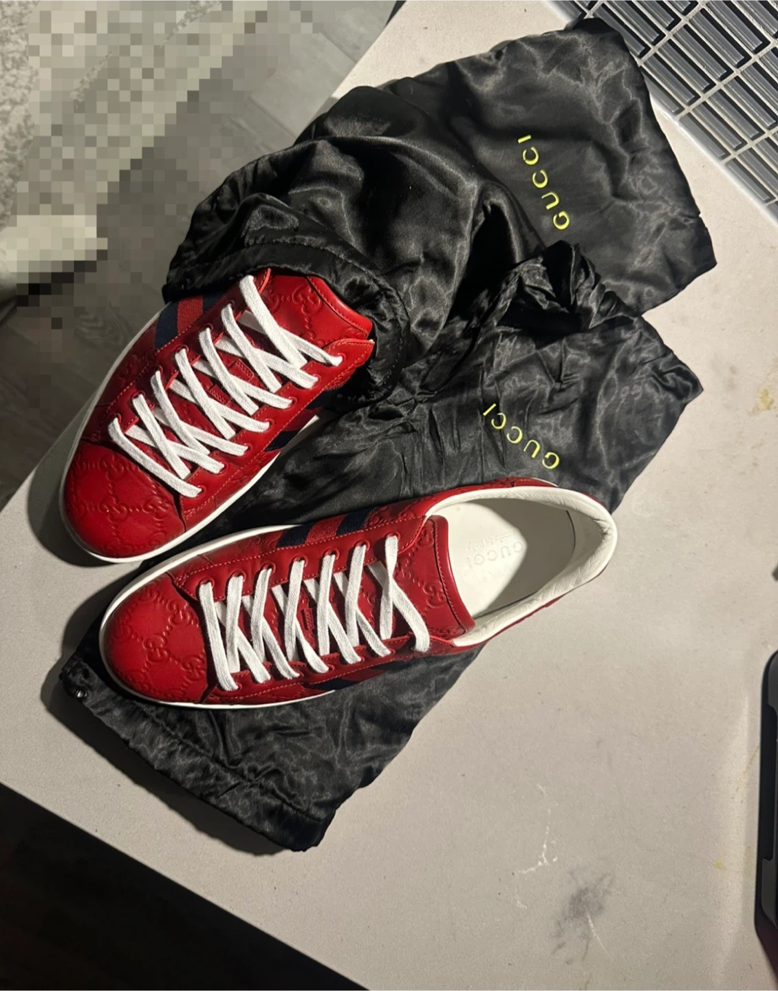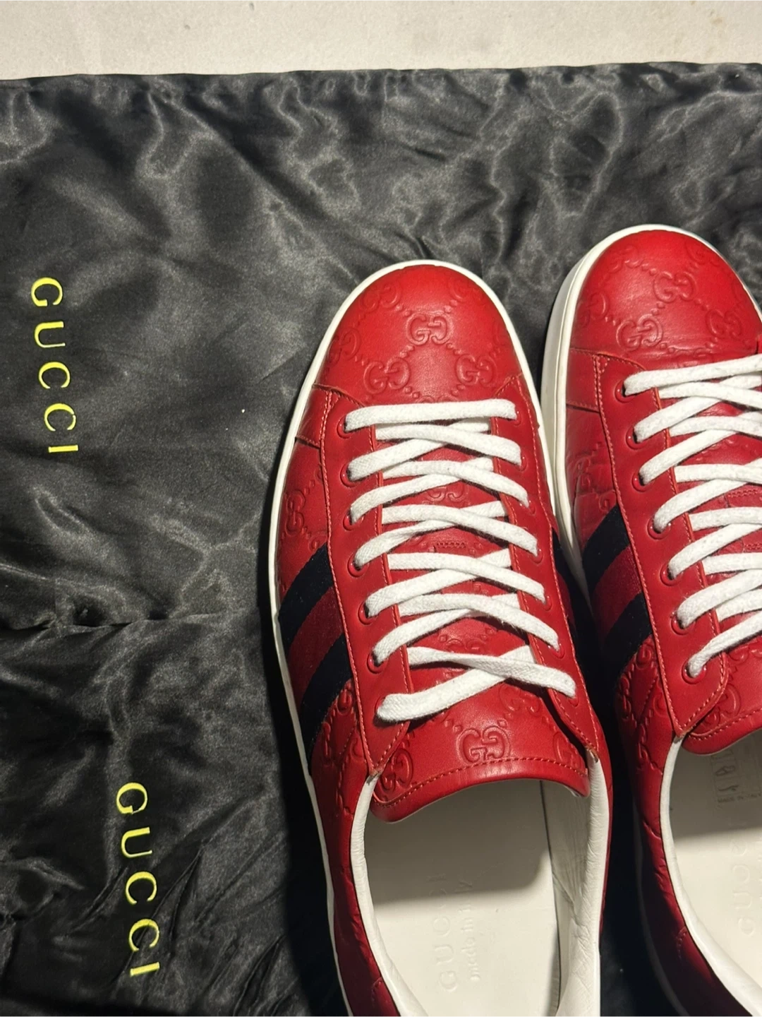 Selling a pair of Gucci sneakers in red leather. They feature the classic Gucci Ace Web Gg Monogram Low Top Sneakers Red. Comes with a Gucci dust bag!