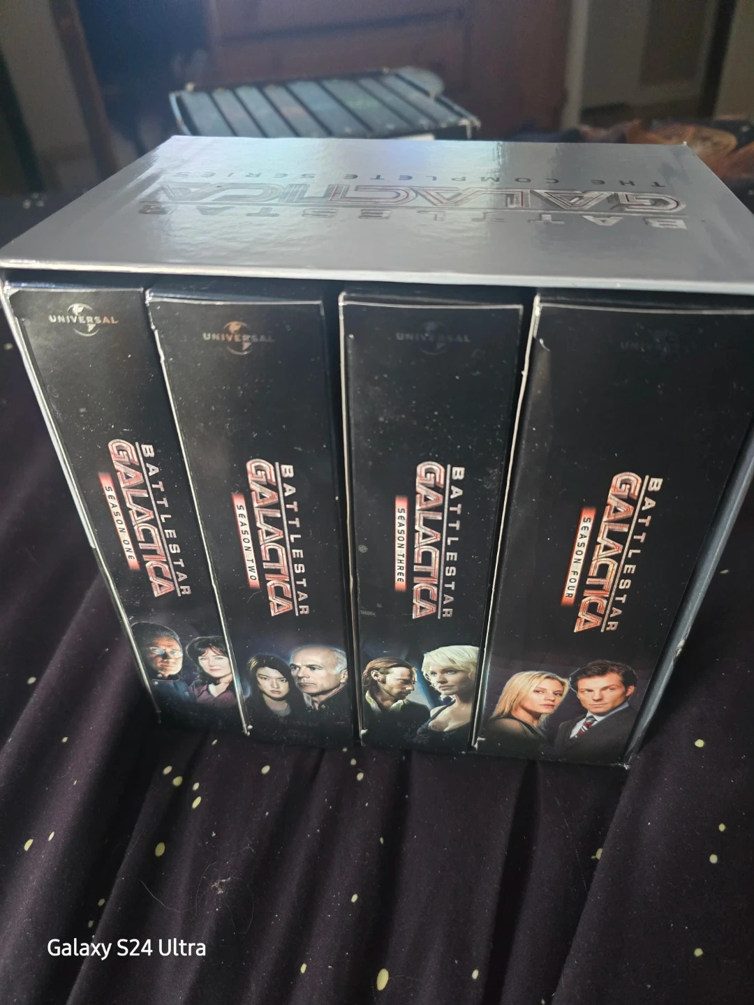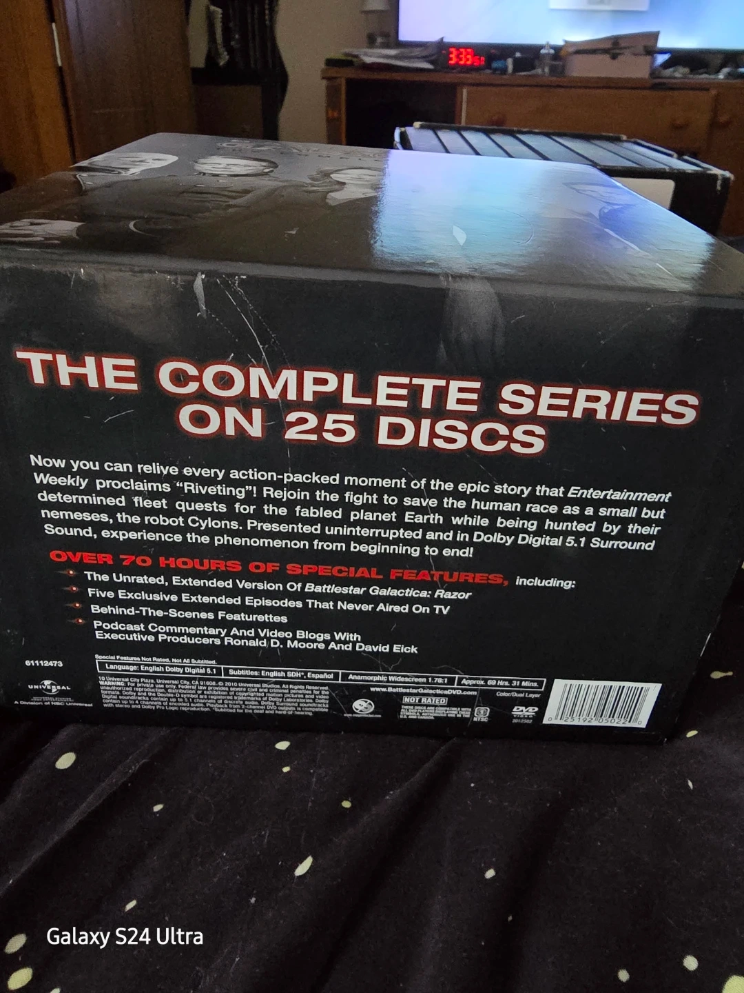 This is the complete series of Battlestar Galactica on 25 discs. It includes over 75 hours of special features like the Unrated Extended Version of Battlestar Galactica: Razor and behind-the-scenes features. Presented uninterrupted and in Dolby Digital 5.1 Surround Sound.