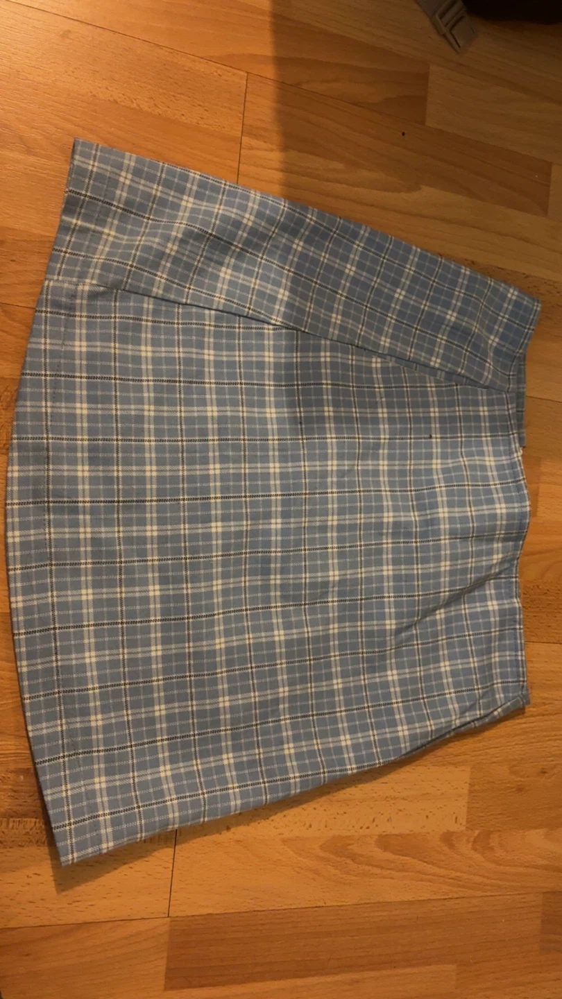 Selling a cute blue plaid skirt! It's in great condition and perfect for adding a touch of preppy style to your wardrobe. The plaid pattern features a mix of light blue, white, and black lines. It's a versatile piece that can be dressed up or down!