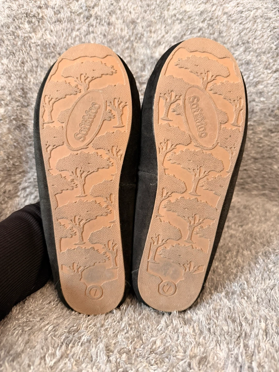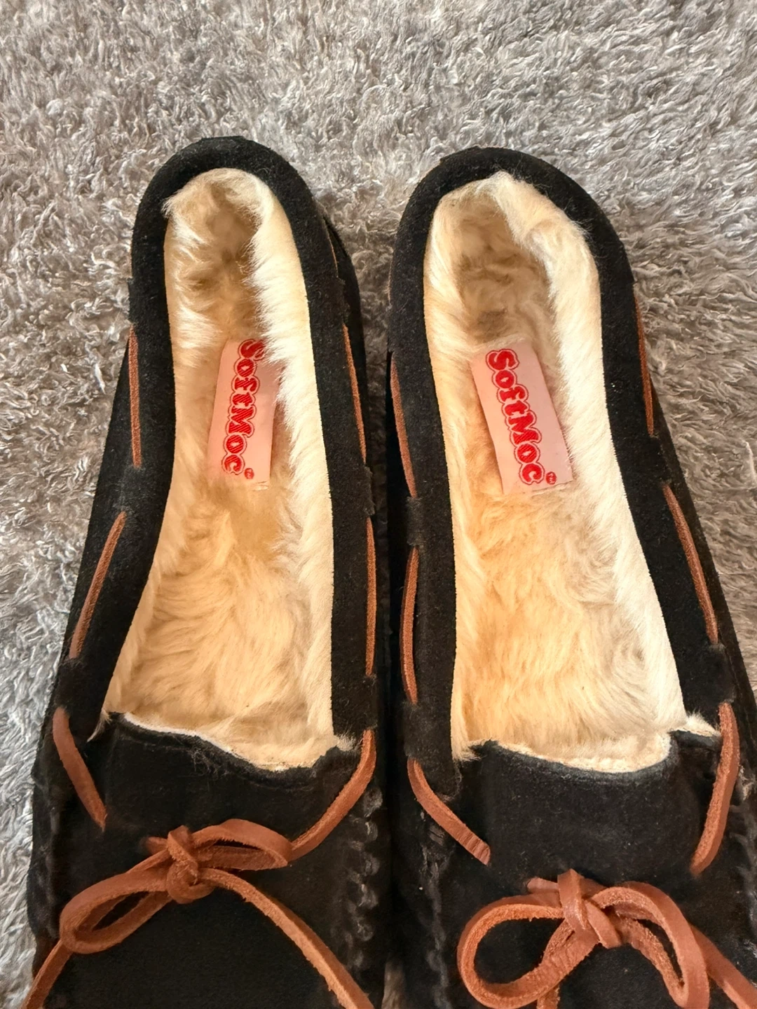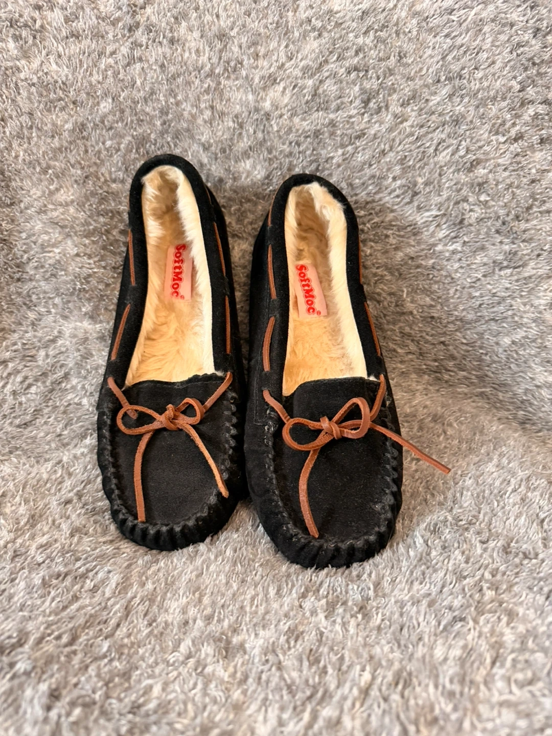 Cozy SoftMoc moccasin slippers in black suede. They're lined with warm, plush faux fur for comfort. The soles are durable and feature a decorative nature-inspired pattern. Size 7. Worn once. No Box.
