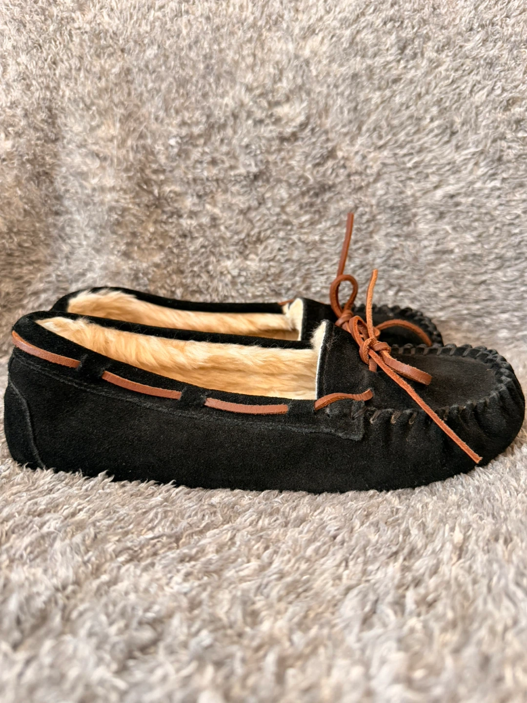 Cozy SoftMoc moccasin slippers in black suede. They're lined with warm, plush faux fur for comfort. The soles are durable and feature a decorative nature-inspired pattern. Size 7. Worn once. No Box.