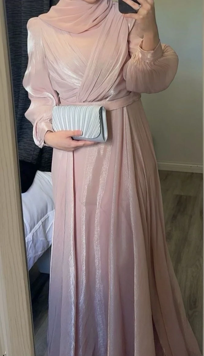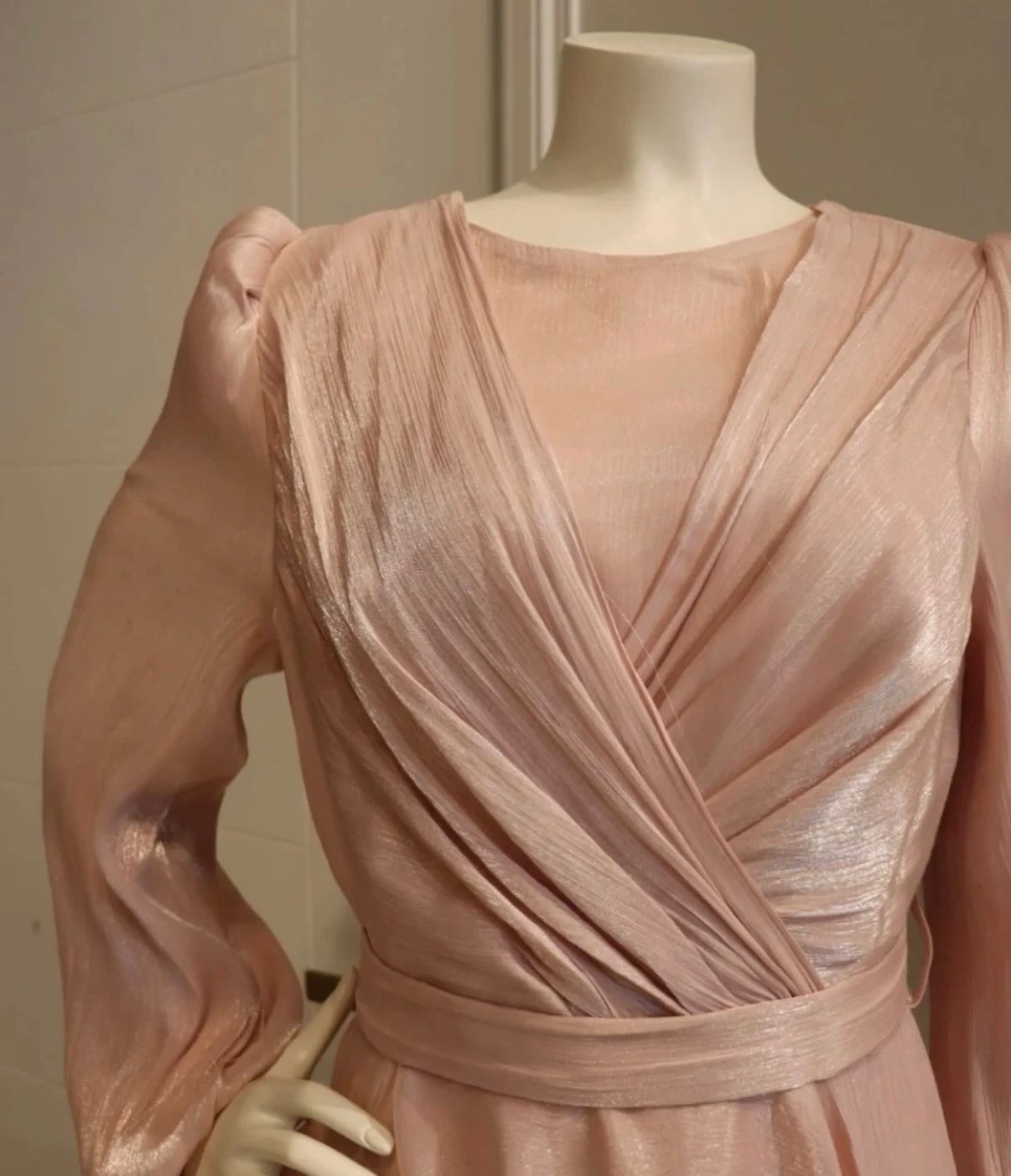Elegant pink maxi dress with a shimmering metallic finish. It features a flattering V-neckline with wrap detailing and long, billowy sleeves. The dress includes a matching fabric attached belt to cinch the waist. Perfect condition worn for a couple of hours.