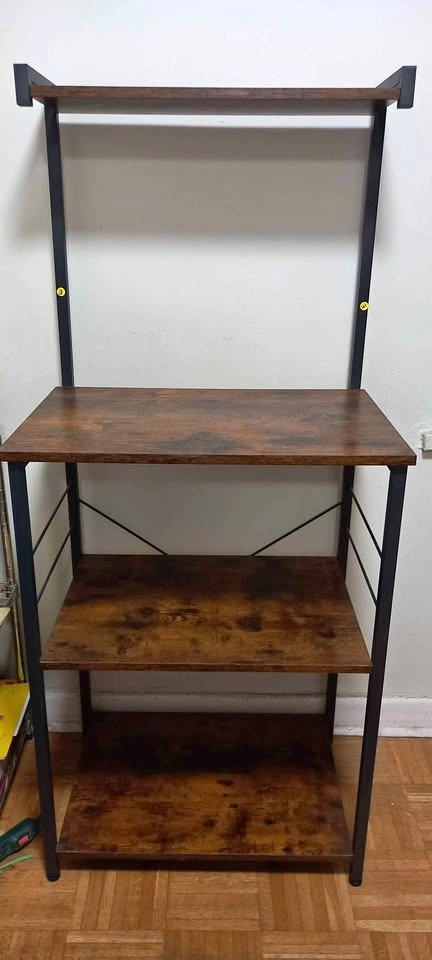 Perfect for adding storage and display space to your kitchen or dining area. Features three shelves, an upper rack for small items, and a sturdy black metal frame with a wood-look finish. Can be disassembled. From a smoke-free, pet-free home. Pick up only.