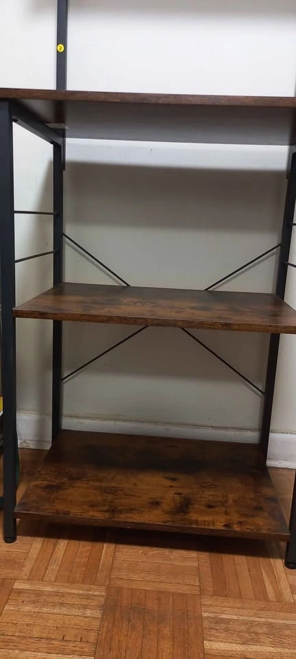 Perfect for adding storage and display space to your kitchen or dining area. Features three shelves, an upper rack for small items, and a sturdy black metal frame with a wood-look finish. Can be disassembled. From a smoke-free, pet-free home. Pick up only.