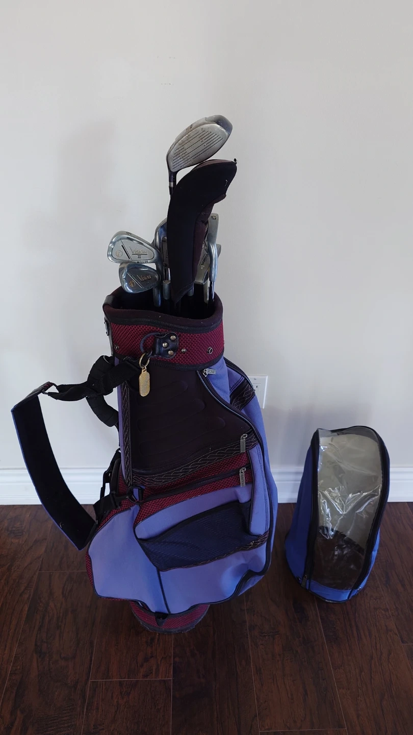 **Bag:** Durable blue and burgundy stand bag with padded shoulder strap.