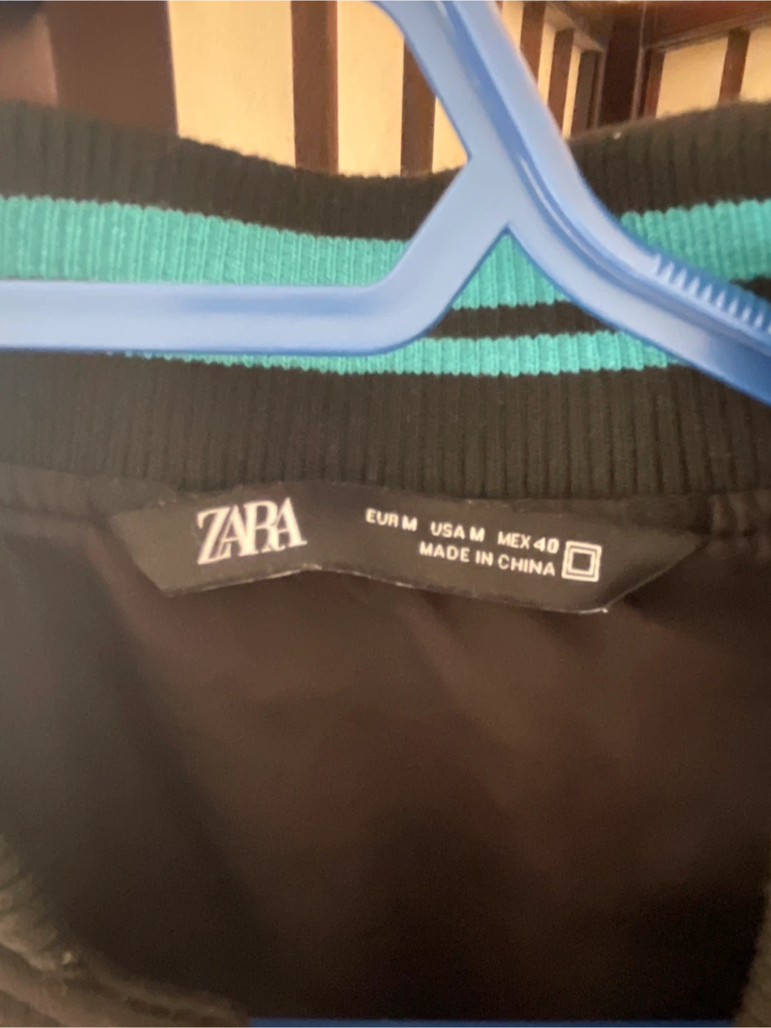 Black varsity bomber jacket from Zara. Features teal accents and ribbed cuffs and hem. Size medium.
