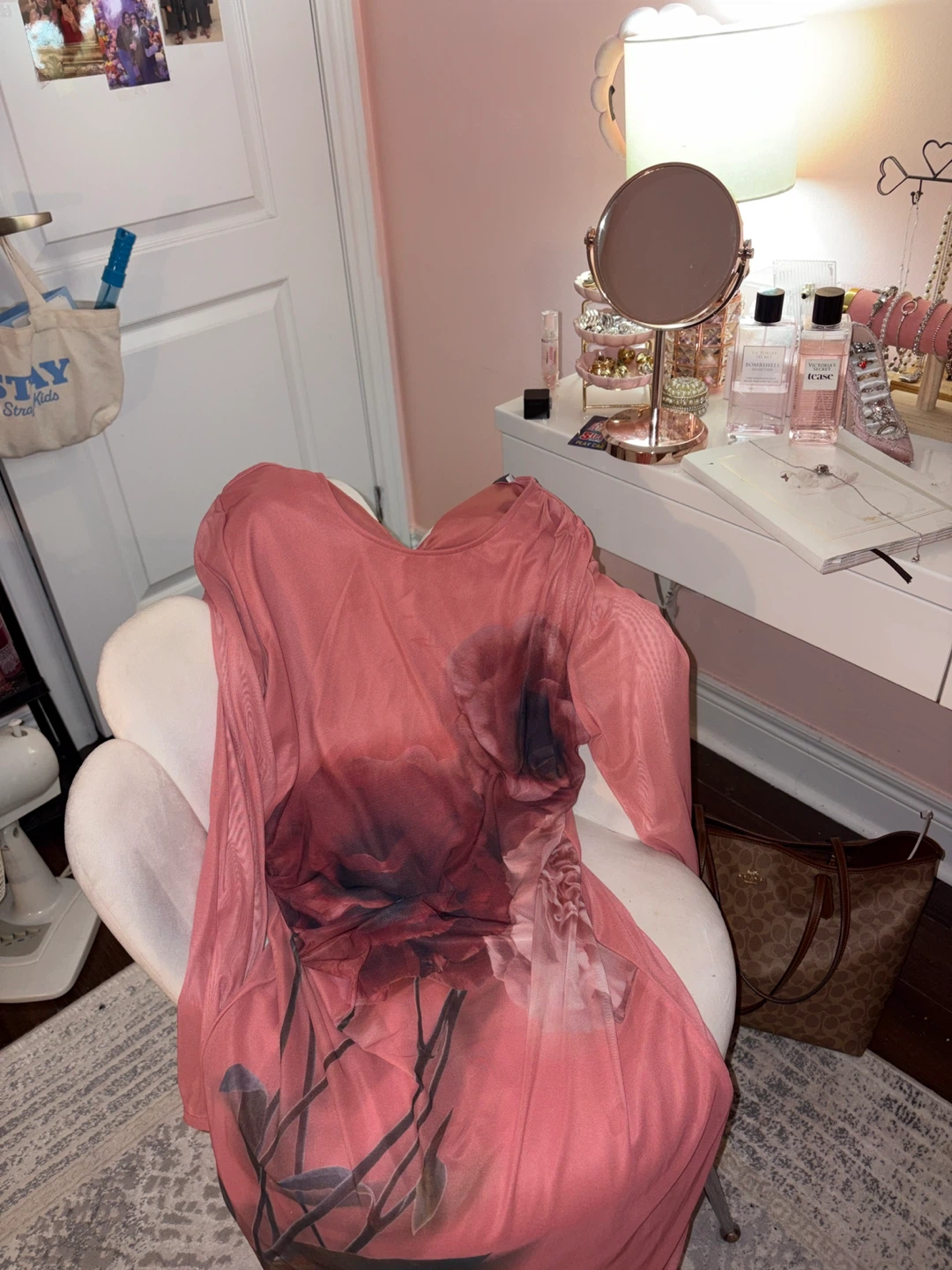 Sheer long-sleeve dress in a lovely pink hue. Features a striking floral print across the bodice and skirt. It's a unique piece for any occasion. The material is lightweight mesh.
