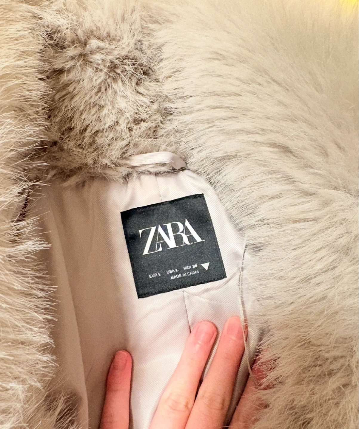 Selling a Zara faux fur coat in a beautiful light grey! It's a size L and is super cozy for the colder weather. Perfect for adding a touch of style to any outfit!
