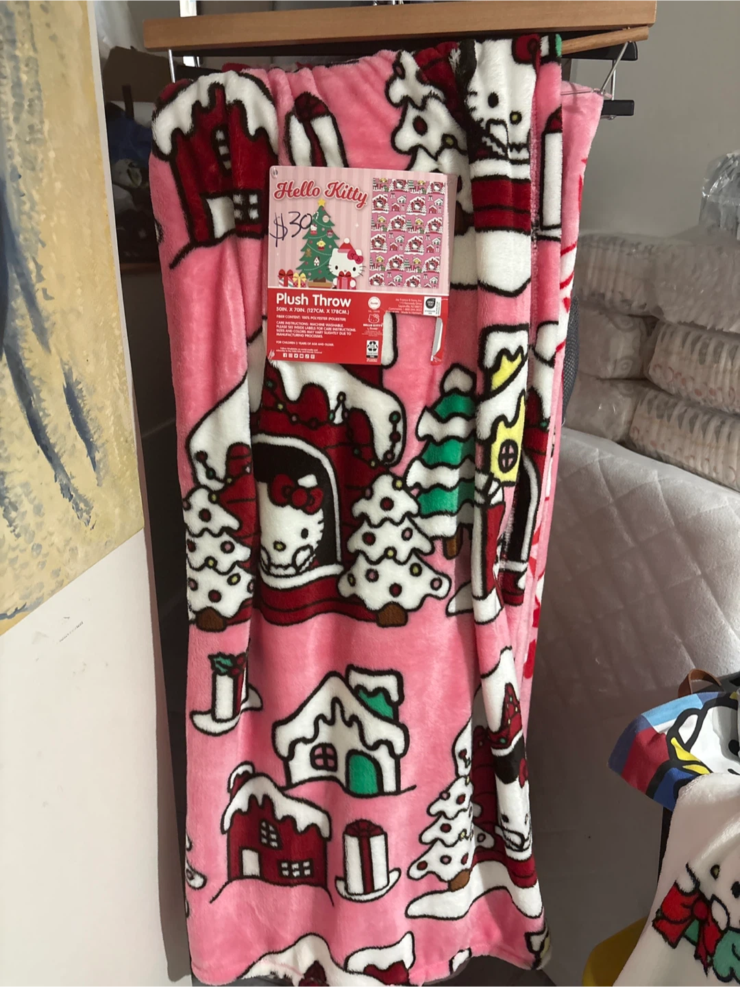 Hello Kitty plush throw available! It measures 50 inches by 70 inches (127cm x 178cm). Originally priced at $30. It's made of polyester