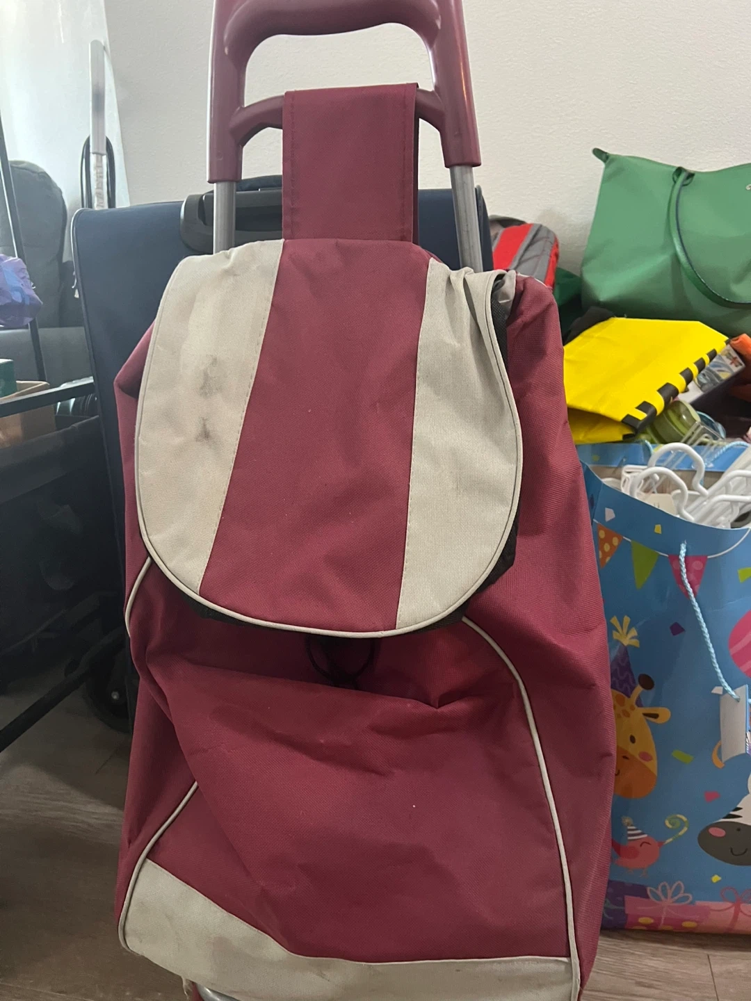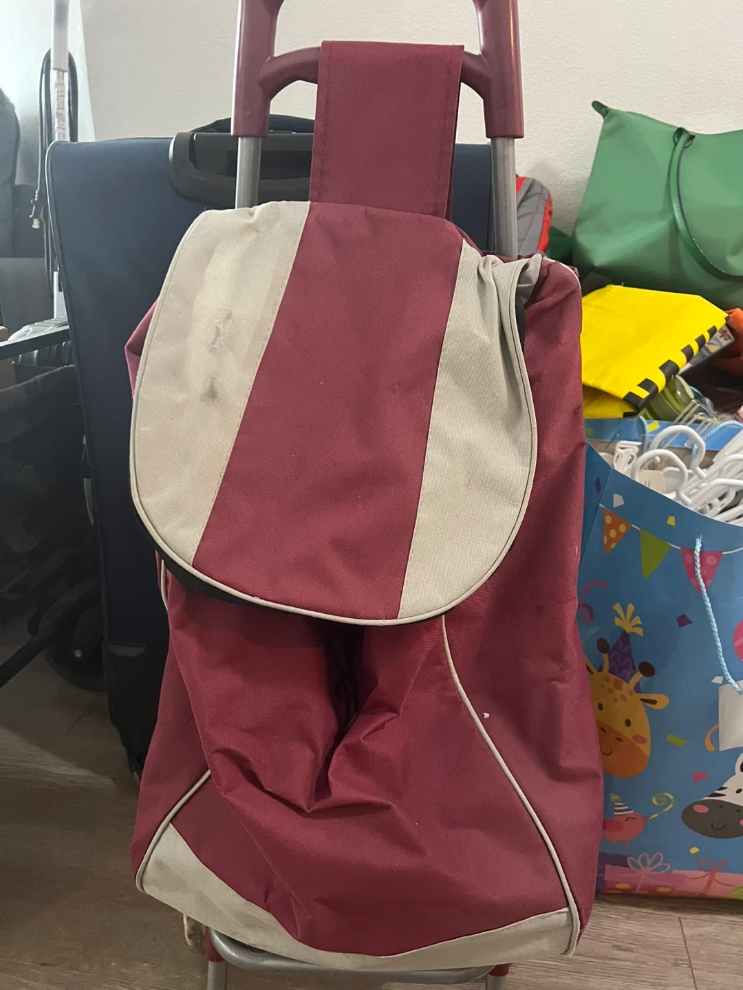 This is a maroon rolling shopping cart bag with cream accents. It features a sturdy handle and wheels for easy transport. The bag is made of durable fabric.