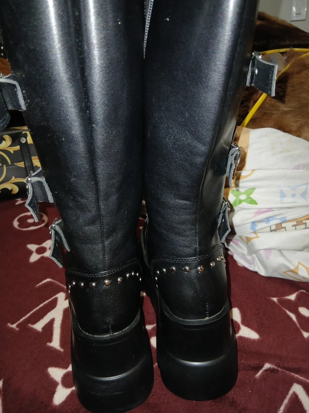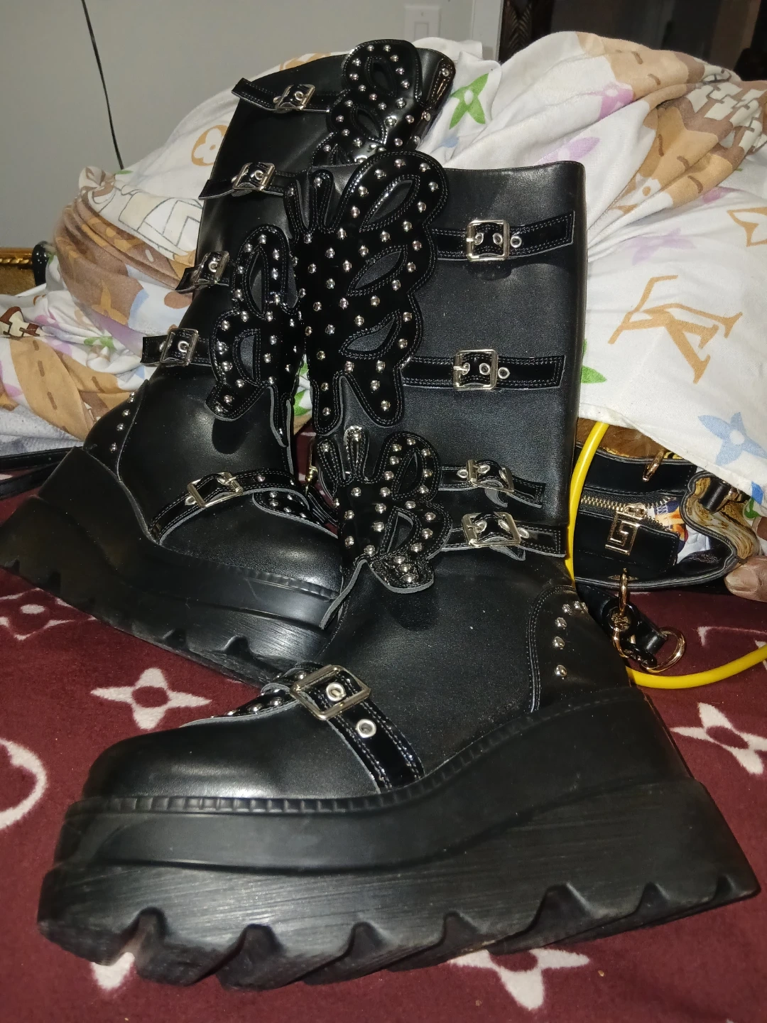 These are a pair of black Demonia platform boots. They feature a unique design with studded detailing and multiple straps with buckle closures. Perfect for adding an edgy touch to your outfit! Super light weight not heavy like others very nice boots size 8.5