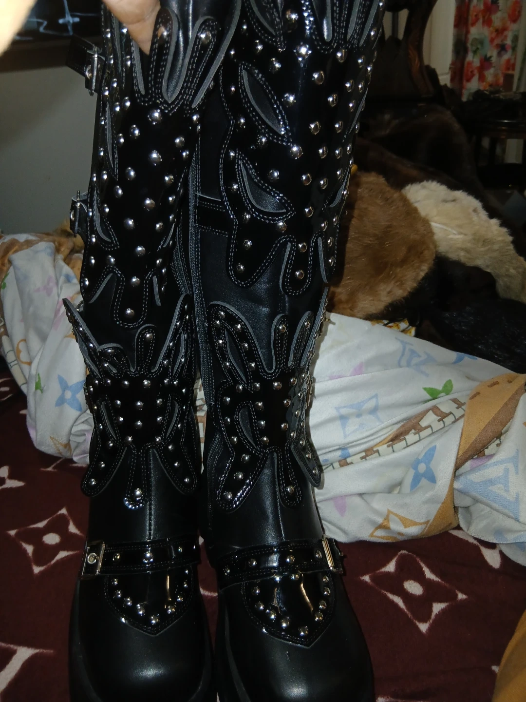 These are a pair of black Demonia platform boots. They feature a unique design with studded detailing and multiple straps with buckle closures. Perfect for adding an edgy touch to your outfit! Super light weight not heavy like others very nice boots size 8.5