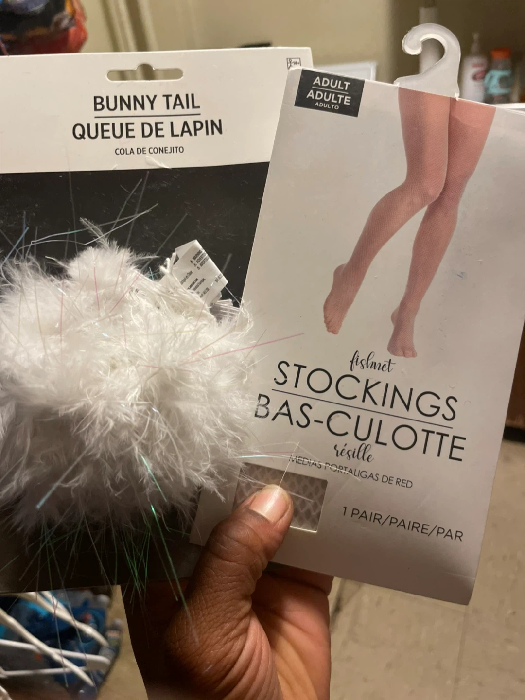 Selling a new adult fishnet stockings and bunny tail costume. The stockings are one pair and the bunny tail is white with some glitter. The stockings are adult size for height 4'11" - 5'8" and weight up to 165 lbs