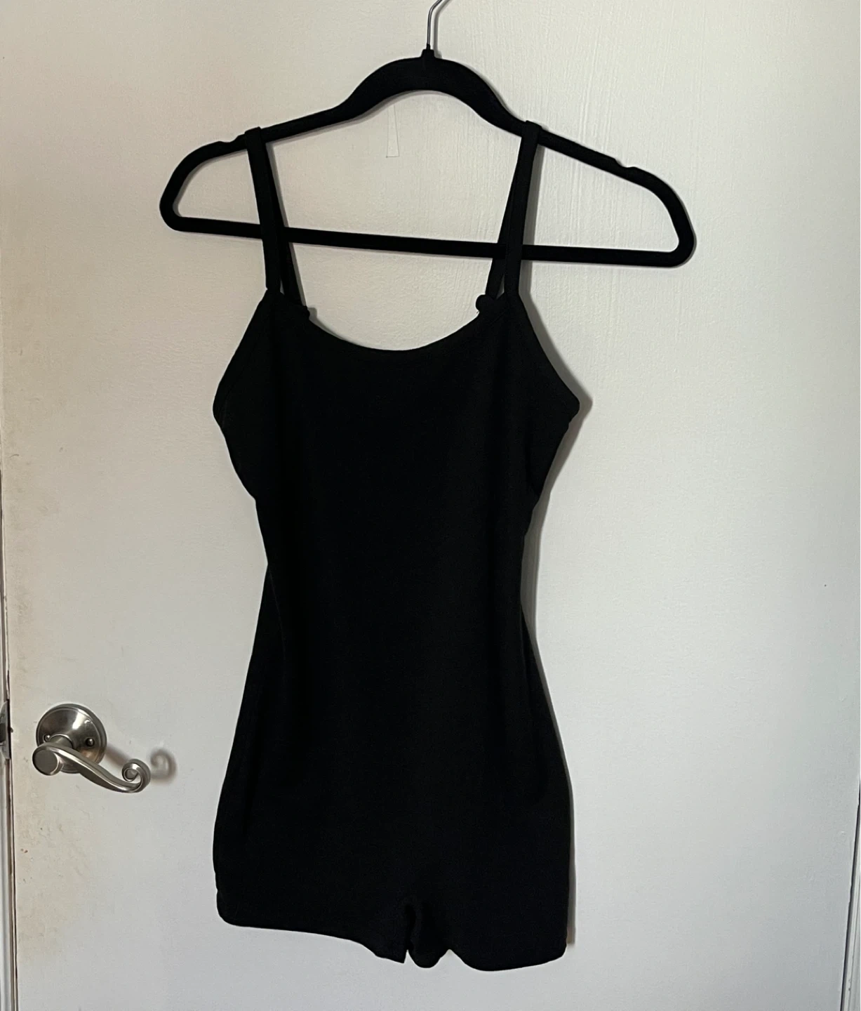 Cute black fitted romper. Slim fit, soft, and comfortable. Good basic to have for lounging, warm weathers, or layering. Includes adjustable straps to cater to your comfort.