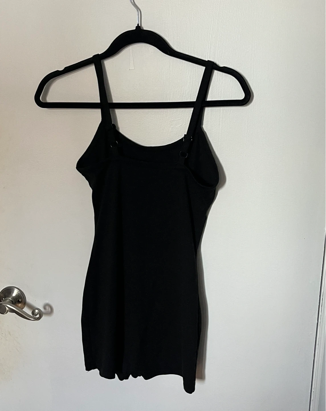 Cute black fitted romper. Slim fit, soft, and comfortable. Good basic to have for lounging, warm weathers, or layering. Includes adjustable straps to cater to your comfort.